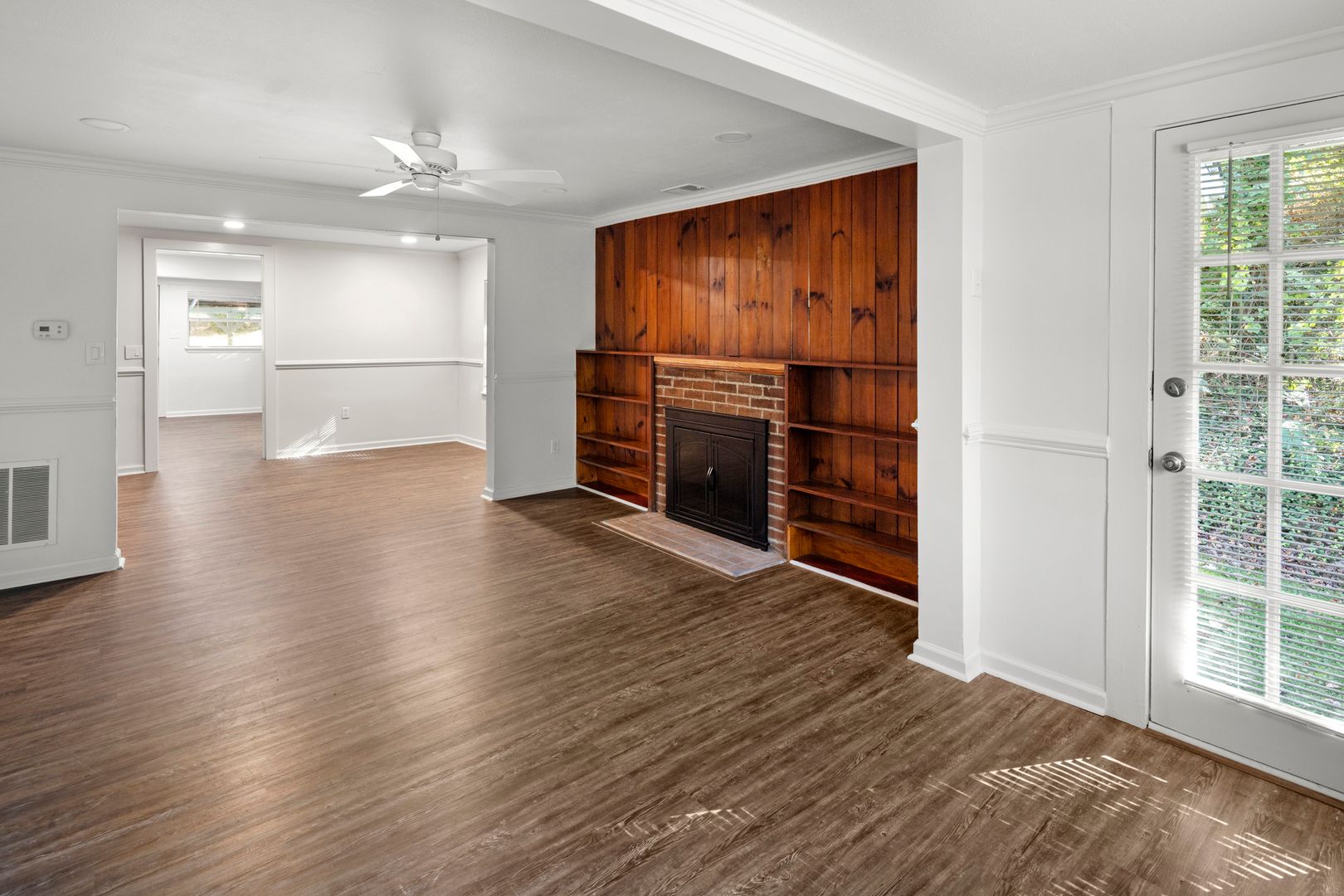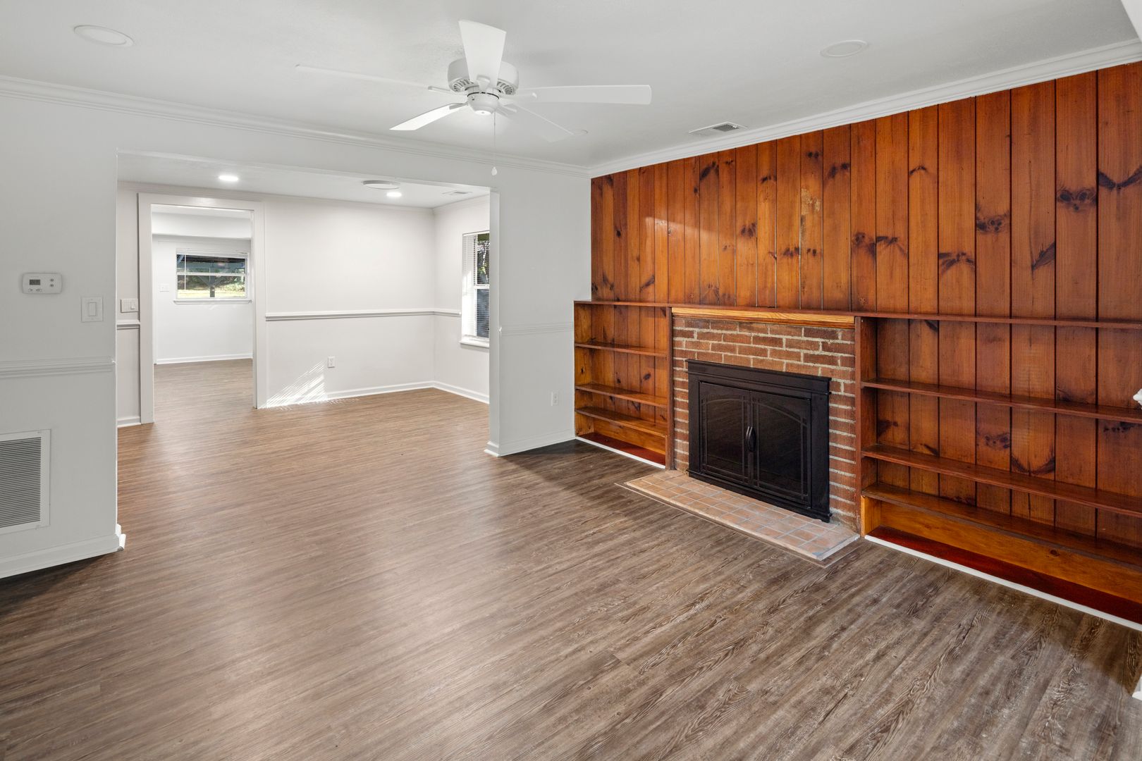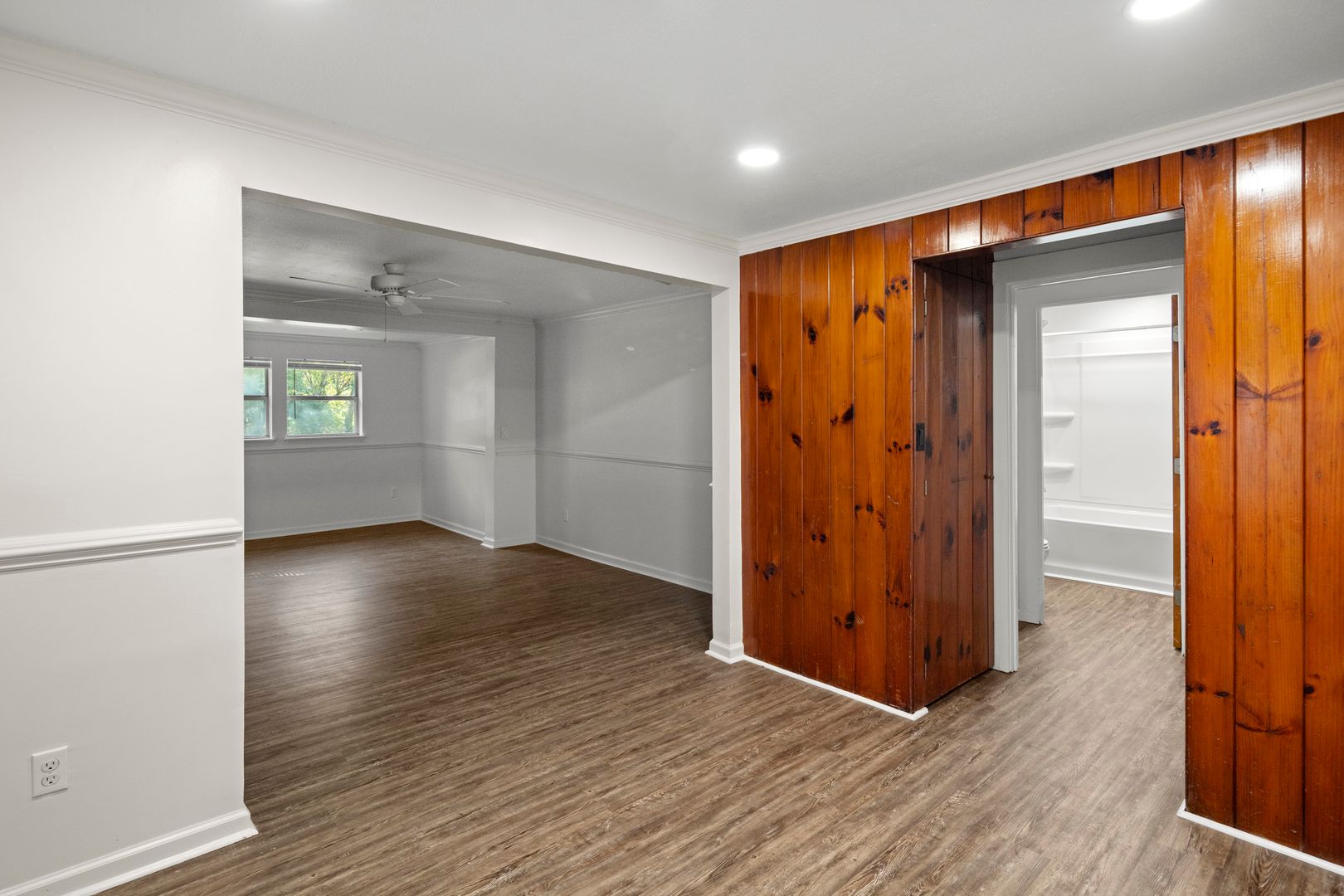 The open dining and living room feature a decorative (inoperable) fireplace and built-in shelving. Original knotty pine paneling surrounds the fireplace and the hall leading to the bedrooms and bathrooms. One of the bedrooms includes an en suite bathroom with a stall shower. The hall bathroom includes a combination bathtub/ shower.