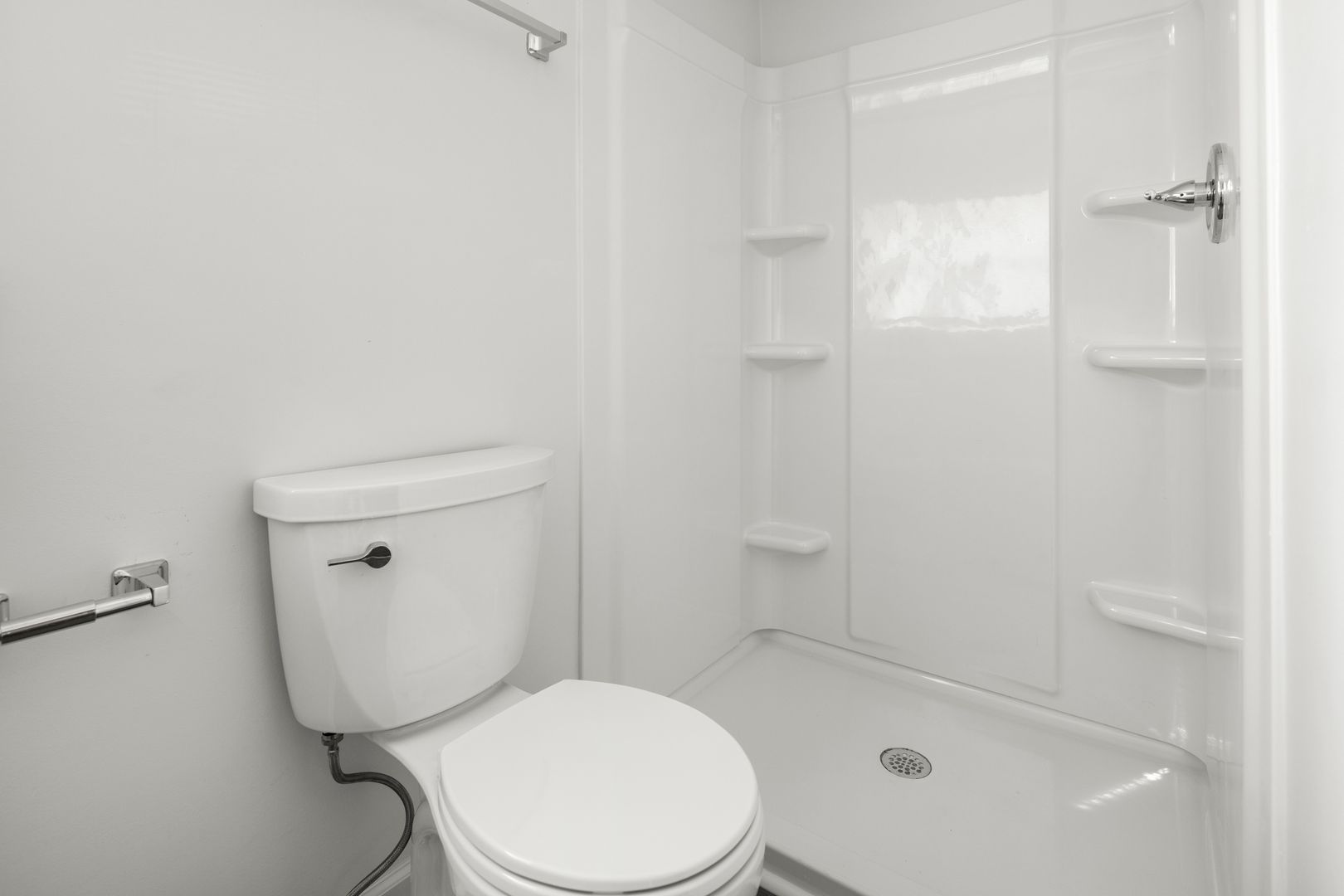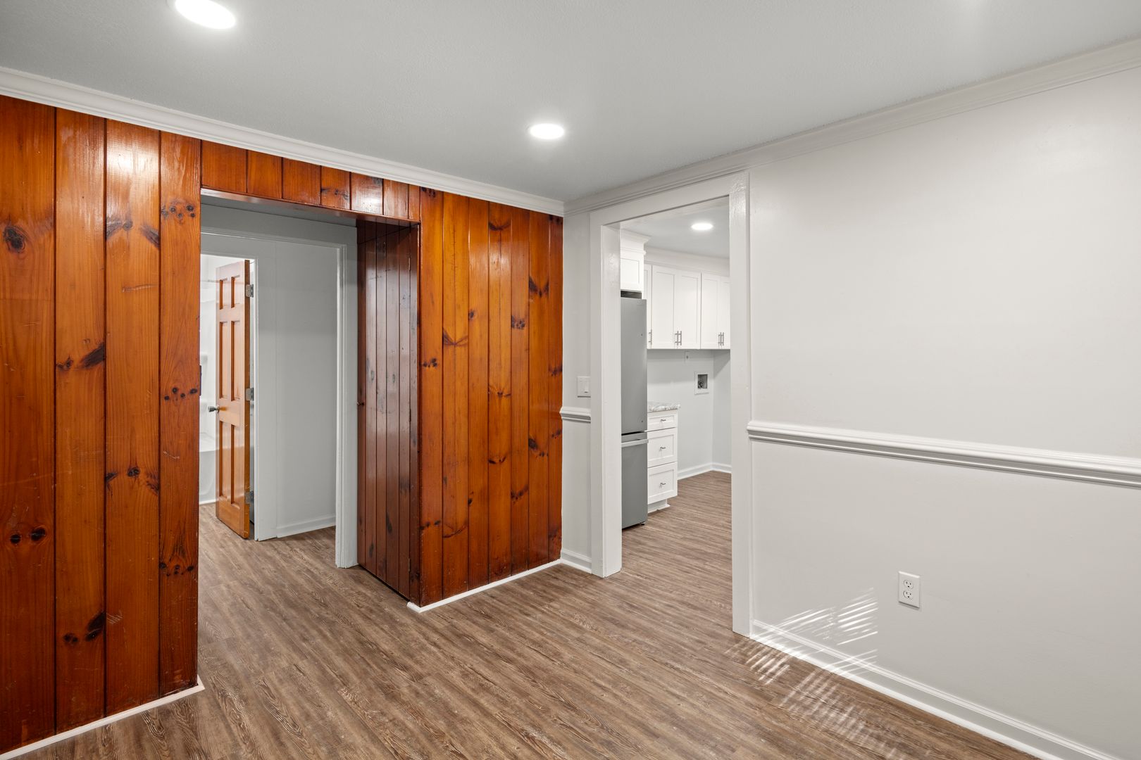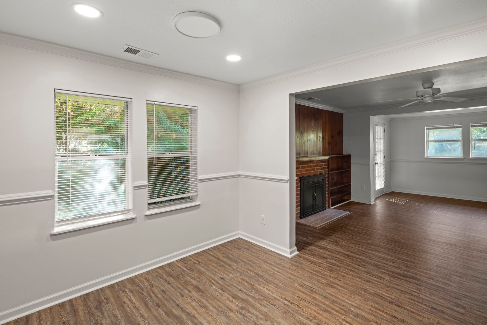 The open dining and living room feature a decorative (inoperable) fireplace and built-in shelving. Original knotty pine paneling surrounds the fireplace and the hall leading to the bedrooms and bathrooms. One of the bedrooms includes an en suite bathroom with a stall shower. The hall bathroom includes a combination bathtub/ shower.