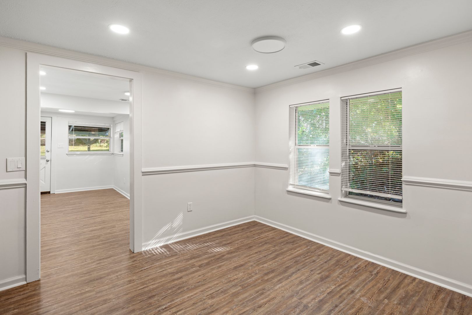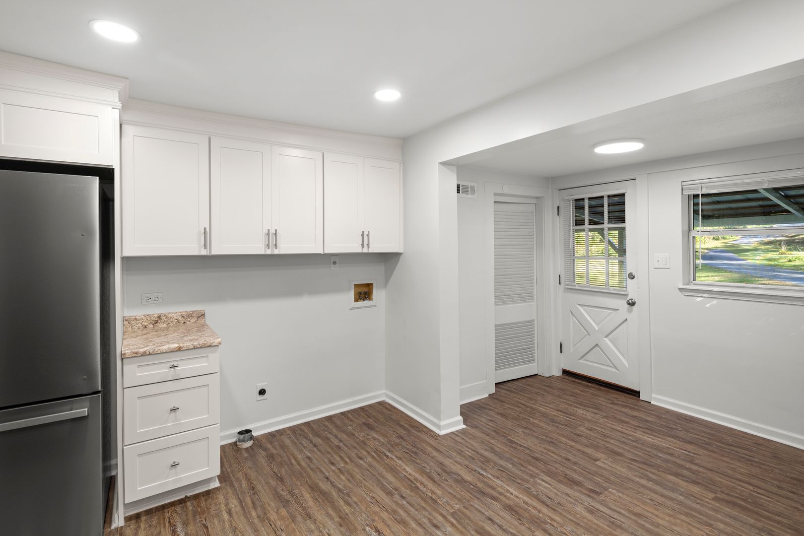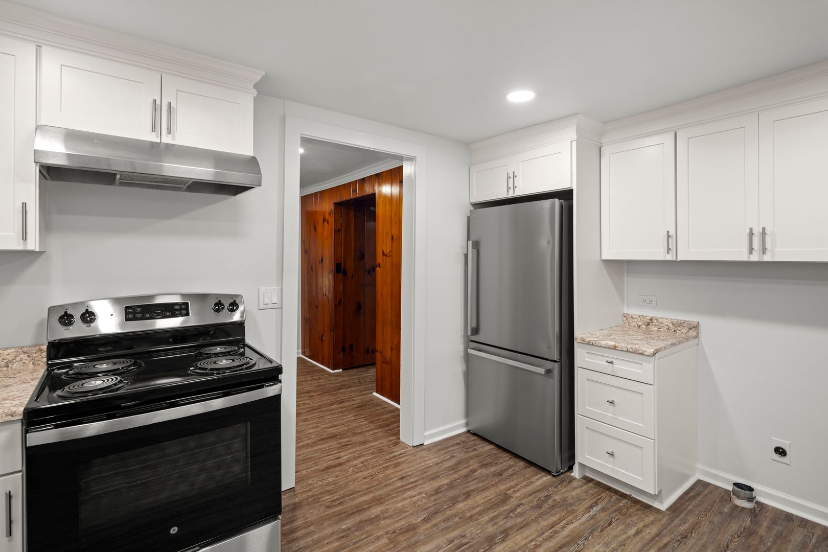 The large covered patio opens into the home’s kitchen equipped with all new cabinets, countertops, and appliances, including the refrigerator, dishwasher, and electric range. Washer and dryer hookups are in the kitchen. Plentiful recessed and dimmable lighting is throughout the kitchen, dining room, and living room.
