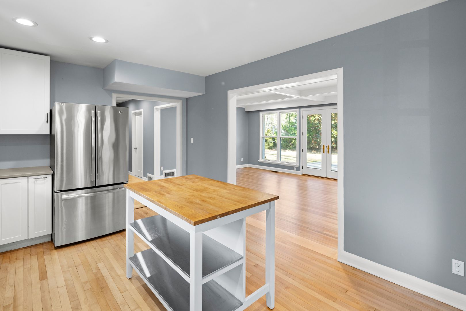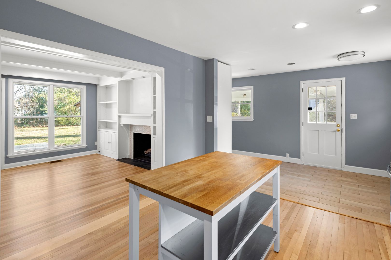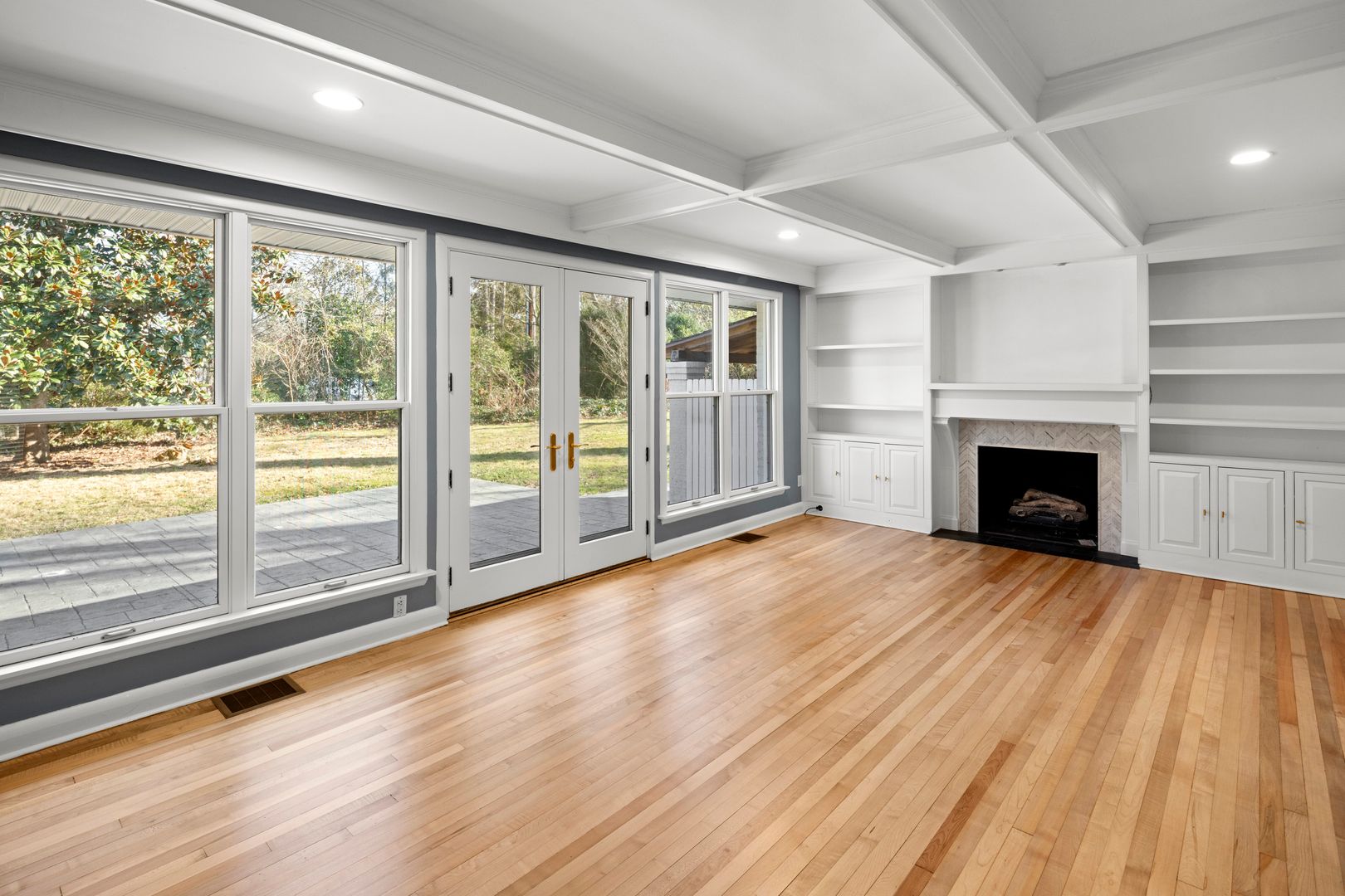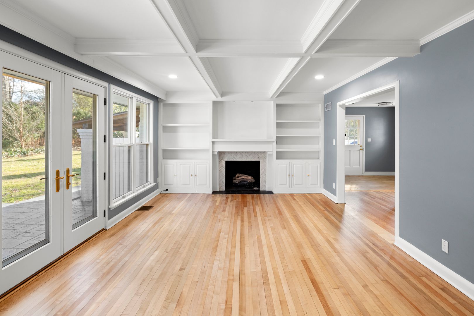 A cozy and elegant living room features coffered ceilings and built-in shelving surrounding the gas fireplace. A wall of windows and French doors overlook the patio and backyard. The adjacent kitchen includes an island, nice cabinetry, solid surface counters, and GE appliances including the electric range, dishwasher, refrigerator, and microwave. The home’s side entry from the carport opens into the mudroom and kitchen. The mudroom has tile floors, cabinetry for storage, and access to the laundry room. The washer and dryer will remain for tenant use but will not be repaired or replaced by the homeowner.