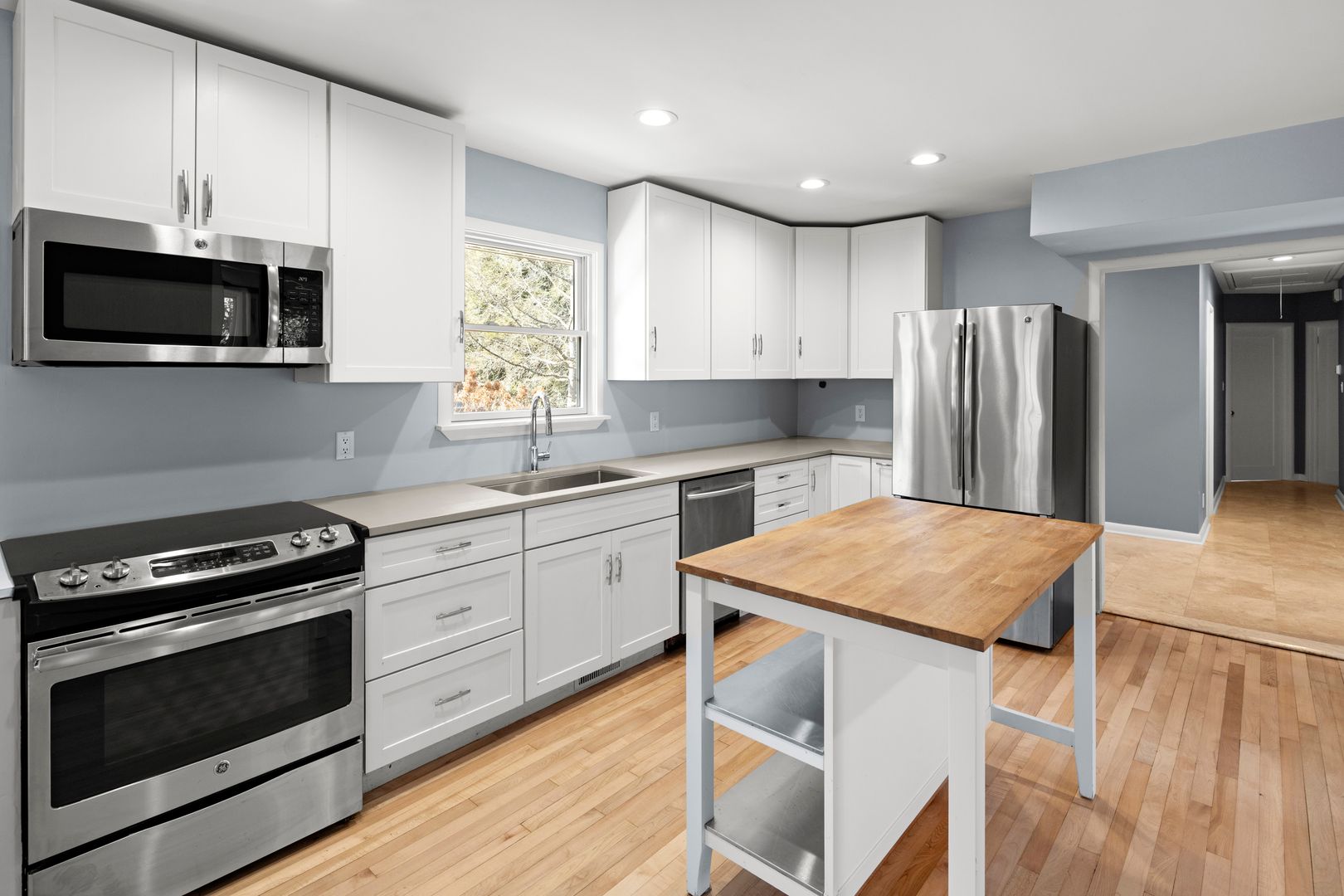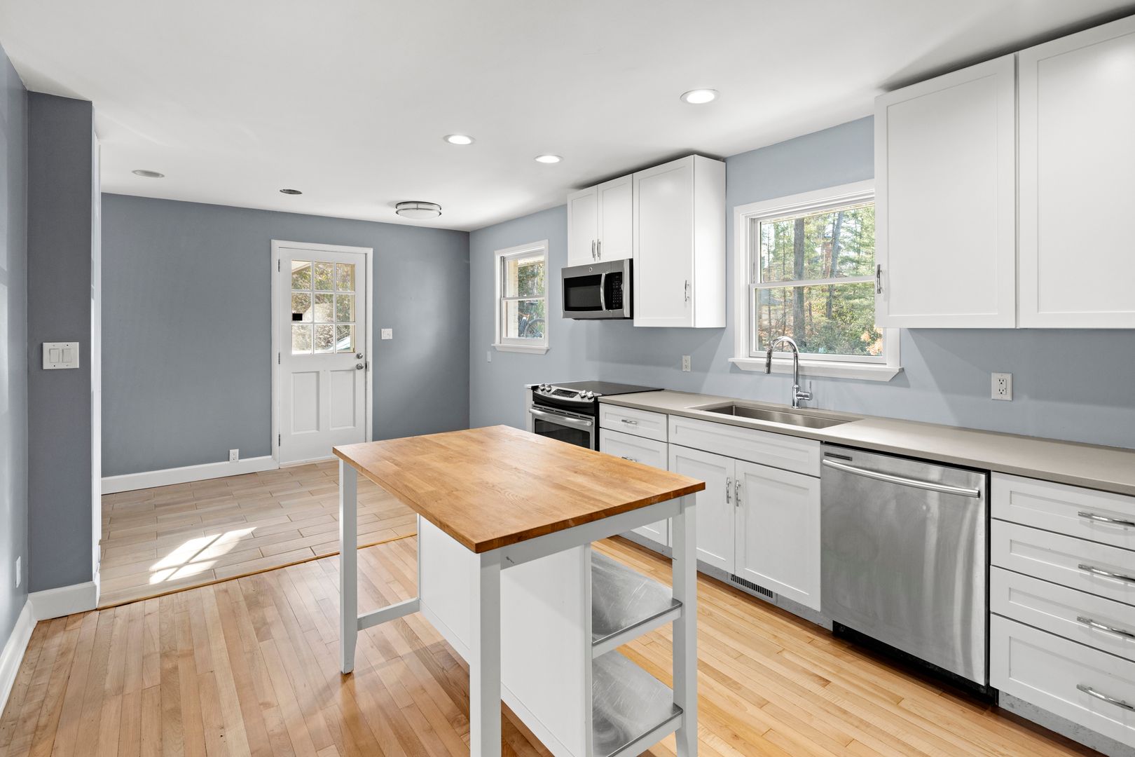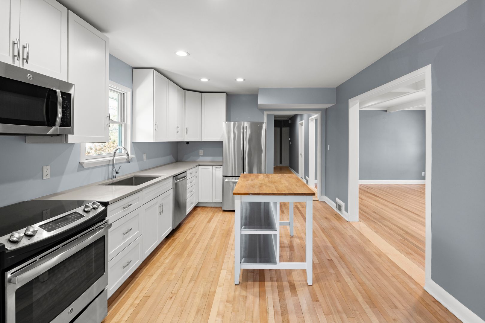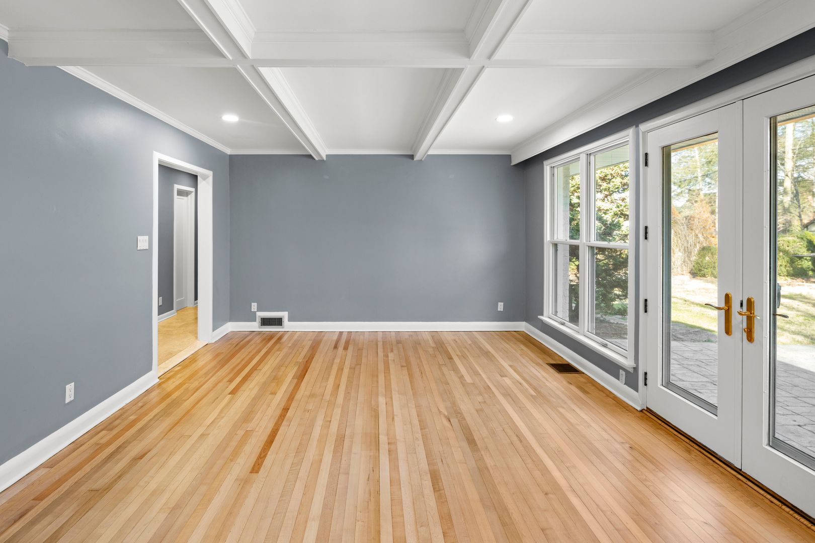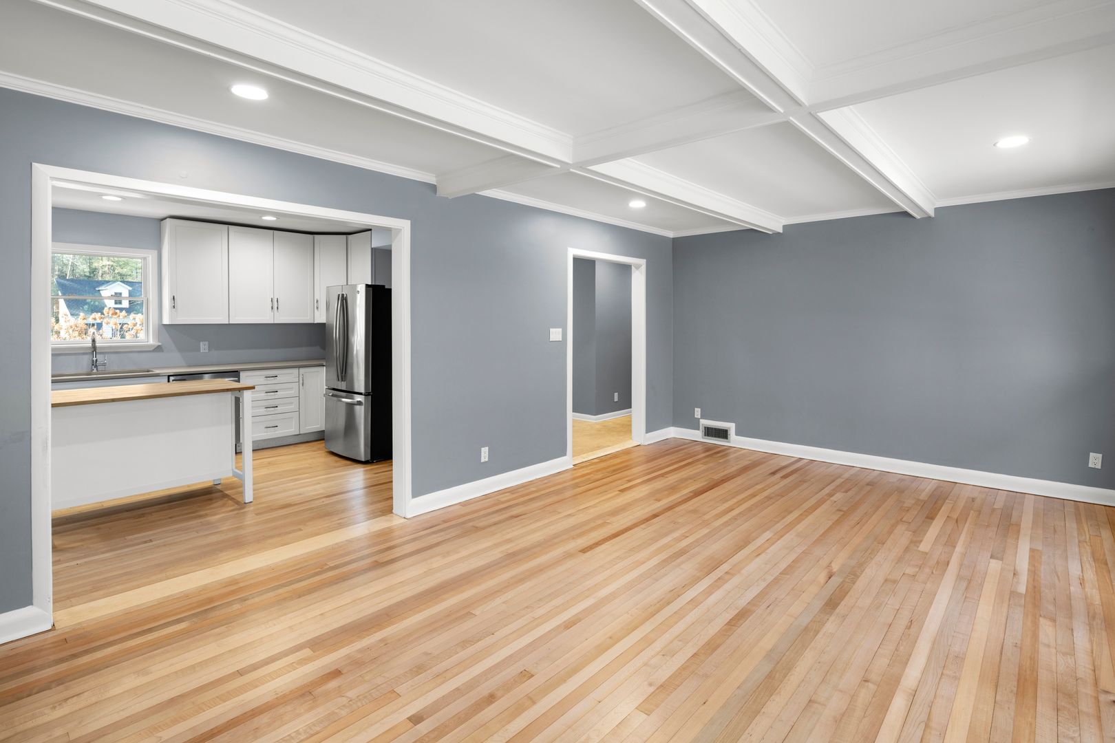 A cozy and elegant living room features coffered ceilings and built-in shelving surrounding the gas fireplace. A wall of windows and French doors overlook the patio and backyard. The adjacent kitchen includes an island, nice cabinetry, solid surface counters, and GE appliances including the electric range, dishwasher, refrigerator, and microwave. The home’s side entry from the carport opens into the mudroom and kitchen. The mudroom has tile floors, cabinetry for storage, and access to the laundry room. The washer and dryer will remain for tenant use but will not be repaired or replaced by the homeowner.