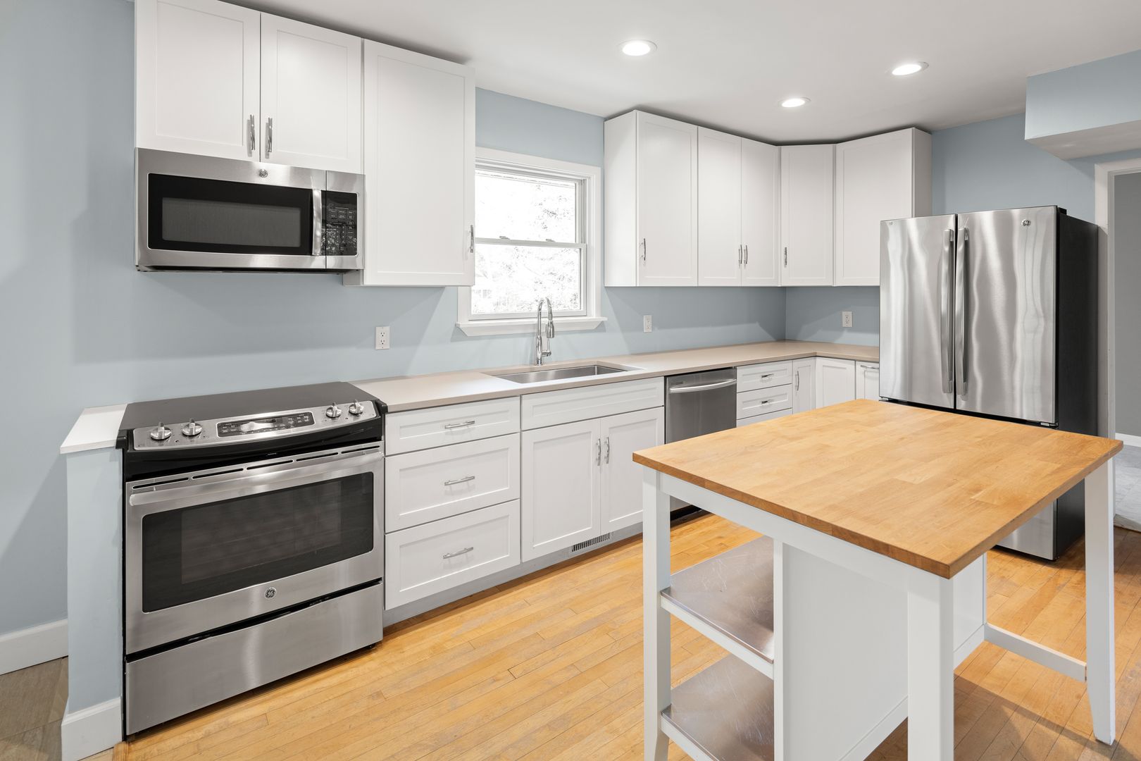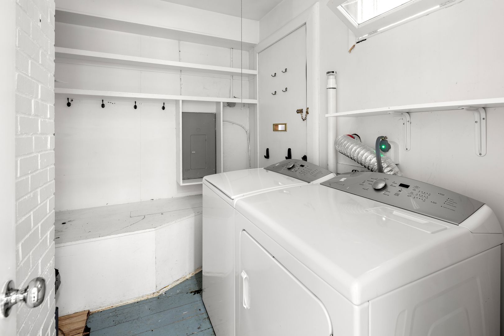 A cozy and elegant living room features coffered ceilings and shelving surrounding the gas fireplace. A wall of windows and French doors overlook the patio and backyard. The adjacent kitchen includes an island, nice cabinetry, solid surface counters, and GE appliances including the electric range, dishwasher, refrigerator, and microwave. The home’s side entry from the carport opens into the mudroom and kitchen. The mudroom has tile floors, cabinetry for storage, and access to the laundry room. The washer and dryer will remain for tenant use but will not be repaired or replaced by the homeowner.