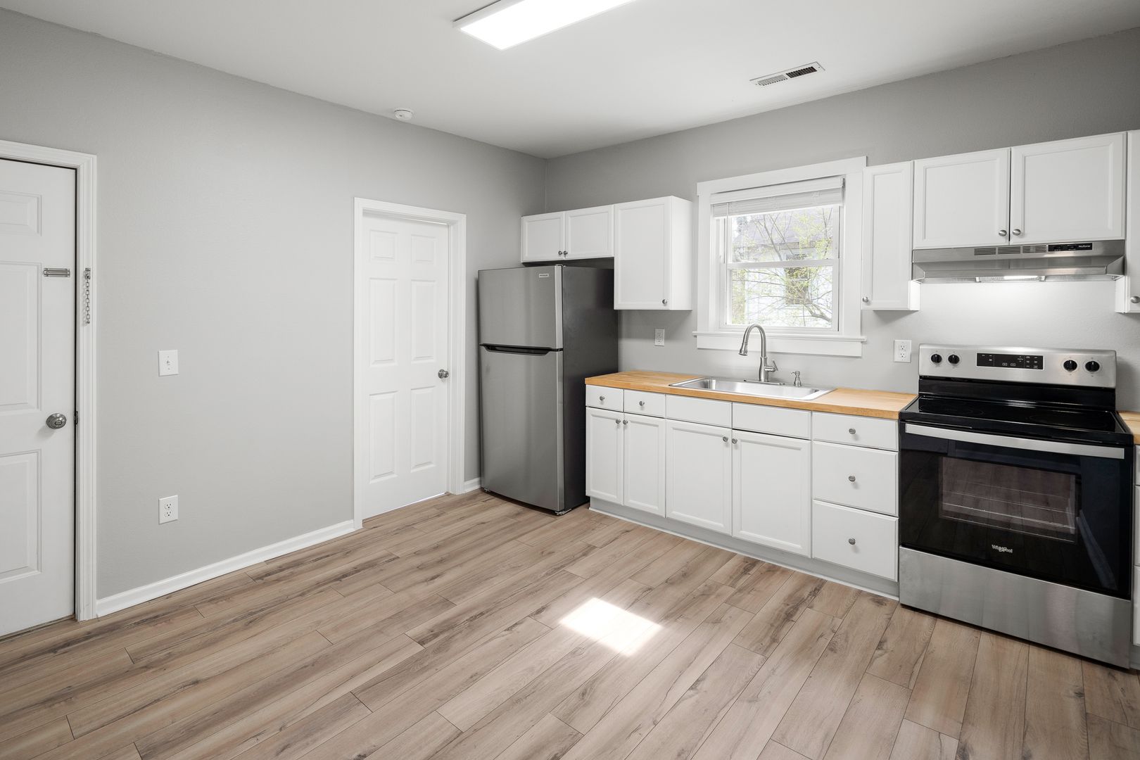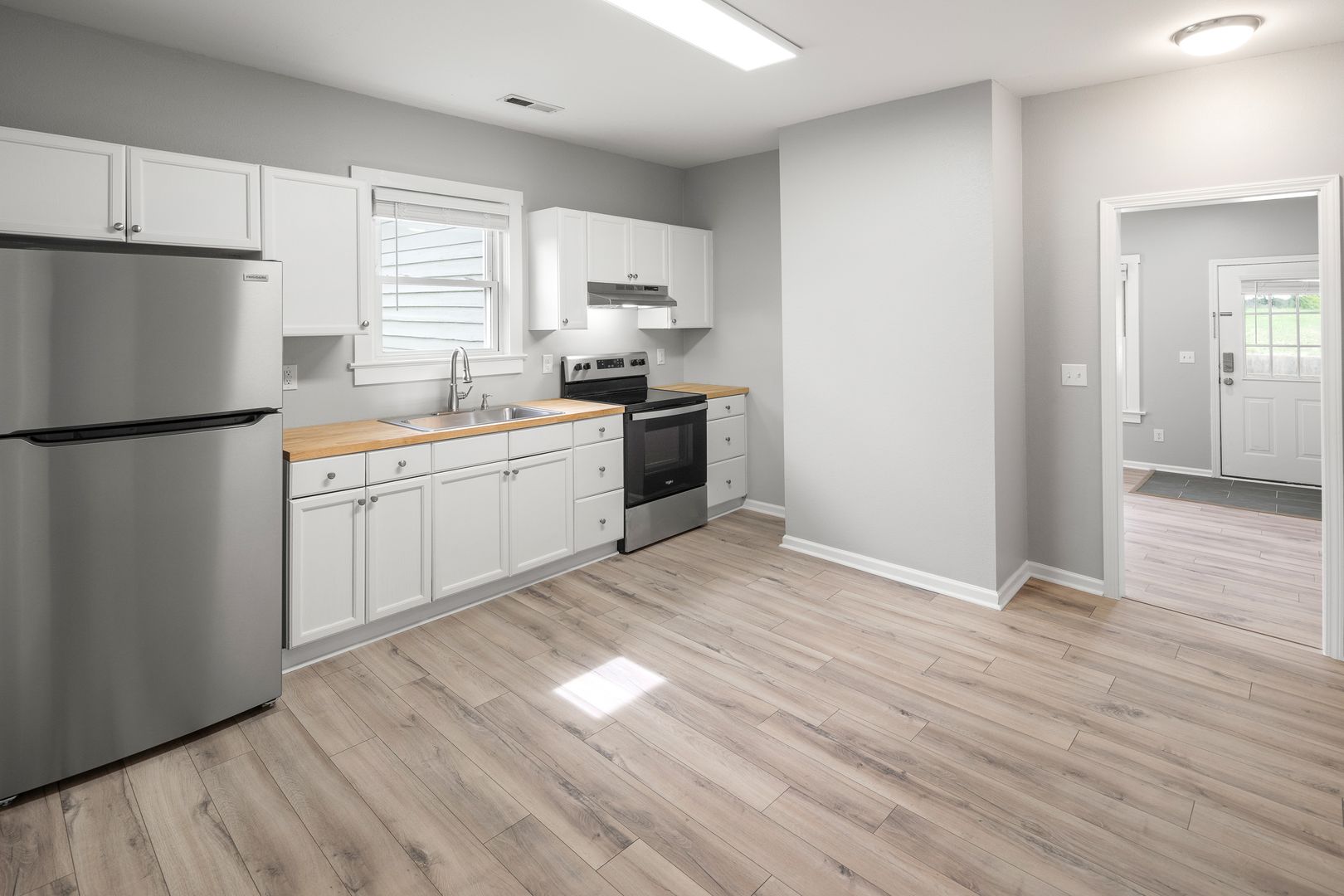 The living room features a cool decorative mantle, dimmable recessed lights, and access to the covered front porch. The eat-in kitchen has butcher block counters, bright white cabinets, and appliances including the electric range and refrigerator. The bathroom, off of the kitchen, includes a nice sink and vanity, tile floors, and a combination bathtub/shower.