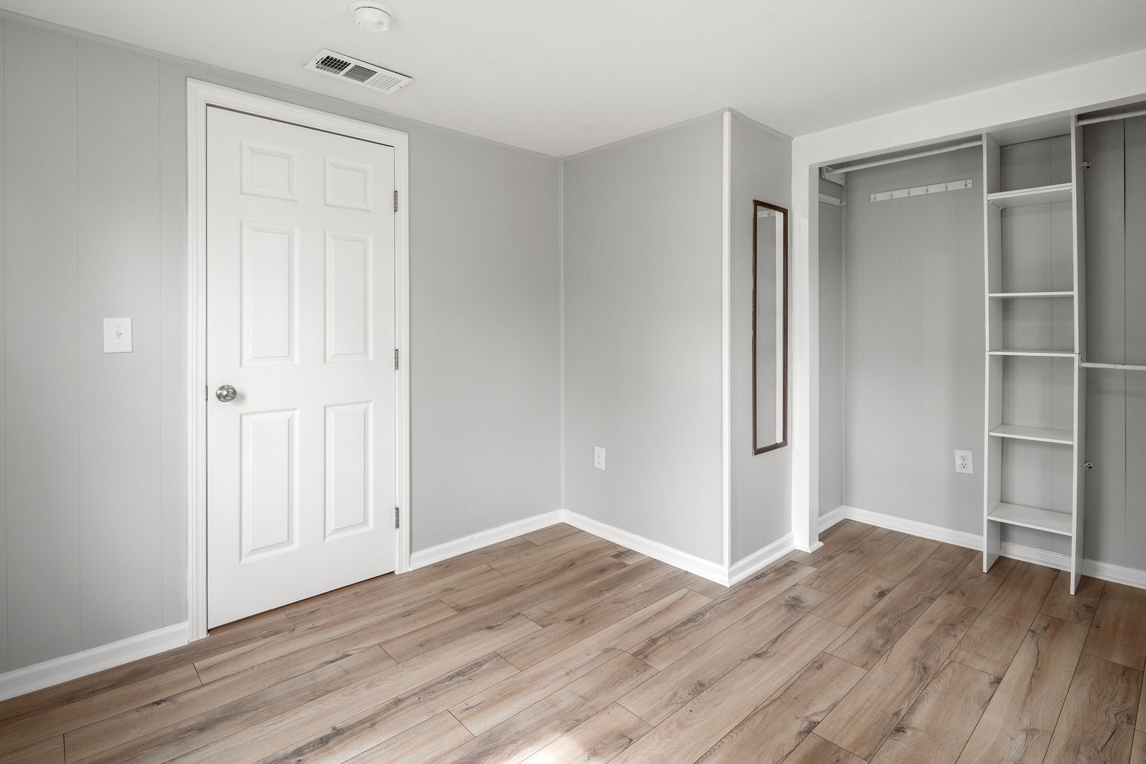 The smaller of the two bedrooms is off of the living room, and the larger bedroom with open storage is off of the kitchen, at the rear of the apartment. The shared washer and dryer is located in the home’s interior stairwell, easily accessible off of the kitchen.