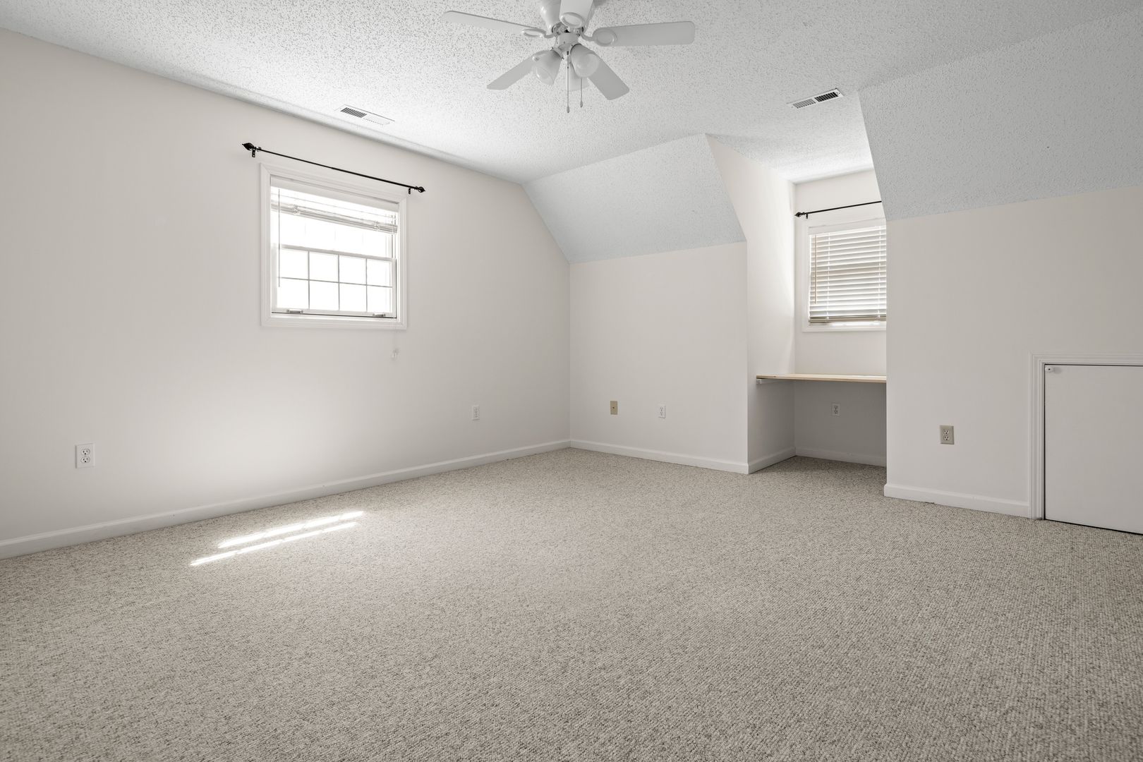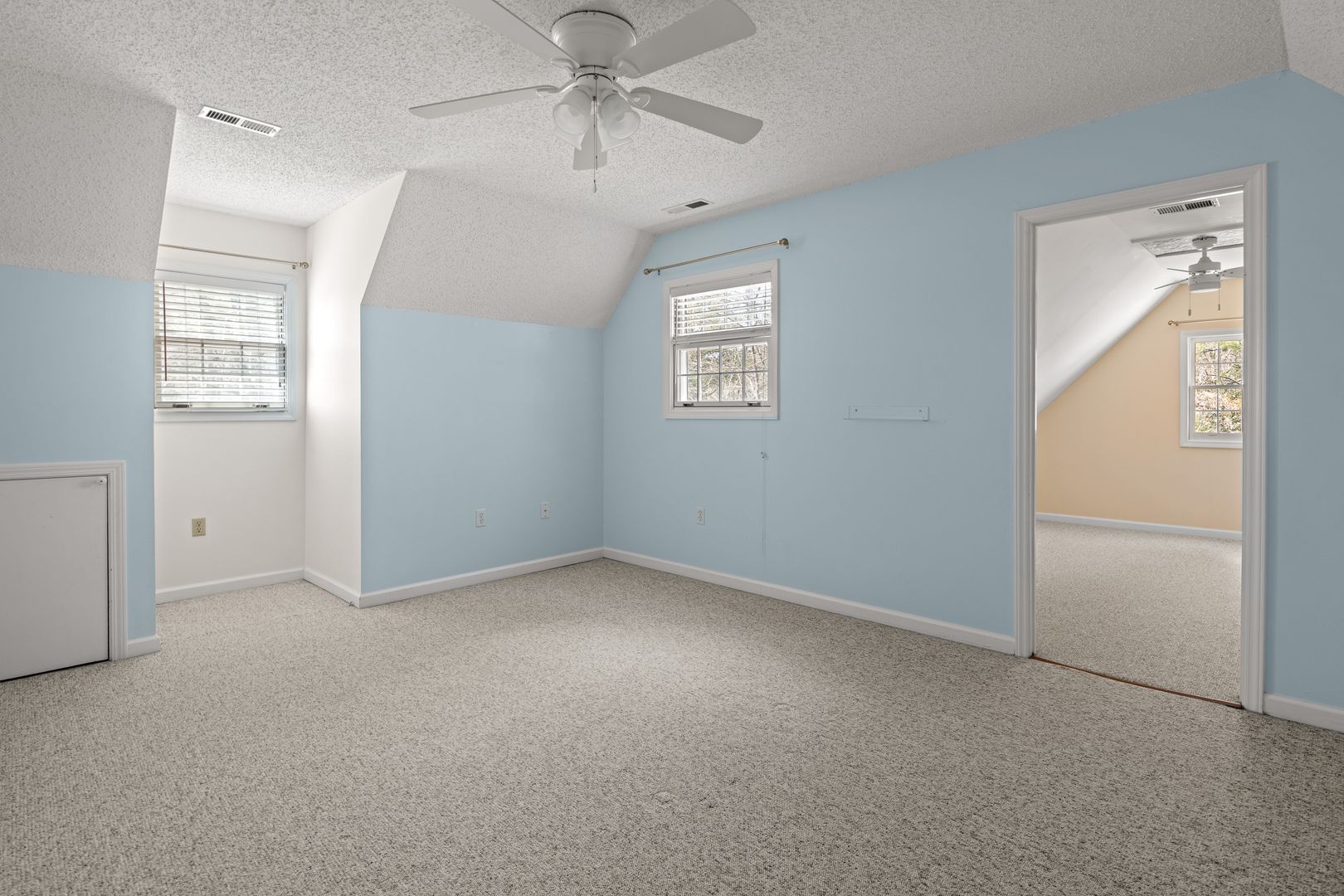 The main floor primary bedroom is carpeted and includes a walk-in closet and en suite bathroom with dual sink vanity, jetted tub, and separate shower. Upstairs are the remaining two bedrooms, the full hall bathroom, plus a bonus room/office. Bedrooms are carpeted. One of the bedrooms has a large adjacent space perfect for a study or play room.