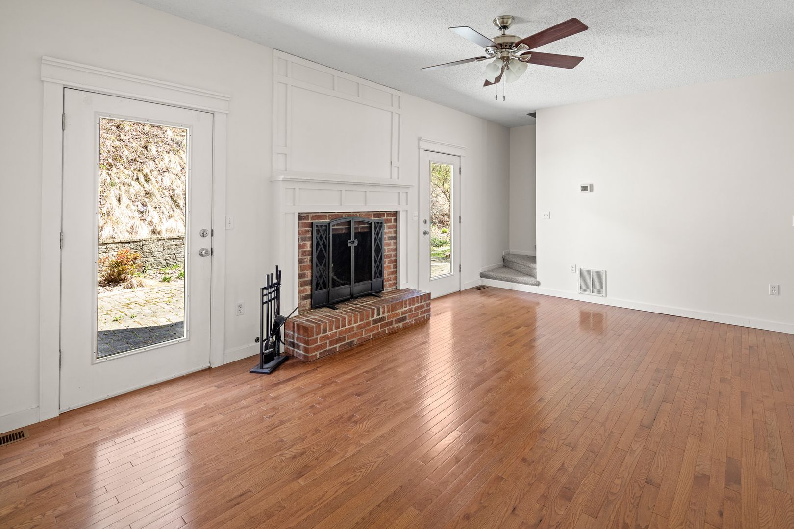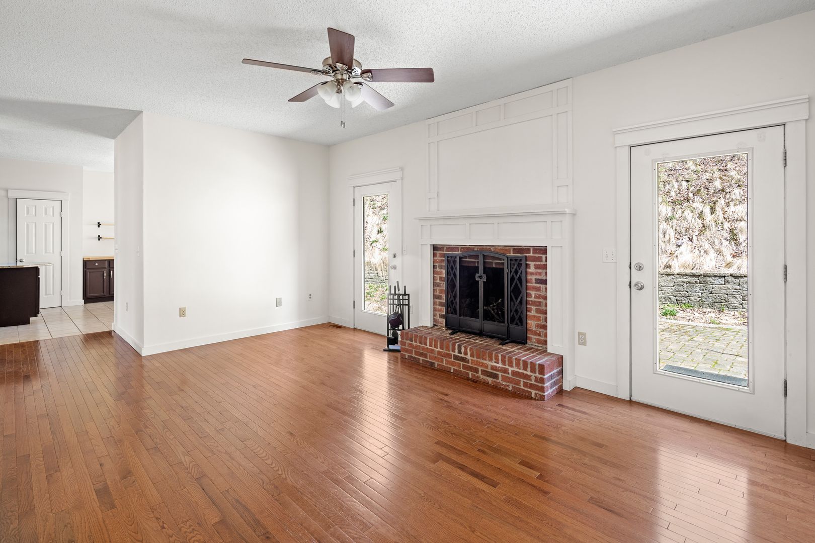 Enjoy the peaceful surroundings from the rocking chair front porch. Inside the front entry are the foyer with a coat closet and powder room. The room to the left of the entry can function as your den, office, or formal dining room. The living room features a wood-burning fireplace, and doors on either side of the mantel open to the paver patio and backyard, which offers an appealing mix of mature landscaping and level, grassy yard. Hardwood floors are throughout these spaces.