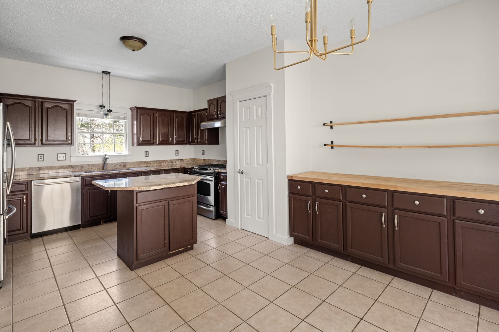The kitchen has tile floors, a pantry, and plentiful counter space with granite tops. Appliances include the gas range, dishwasher, and French door refrigerator. The spacious eat-in dining area has a built-in sideboard and windows overlooking the backyard. Laundry is off of the kitchen/dining, and the washer and dryer will remain for tenant use but will not be repaired or replaced by the homeowner.