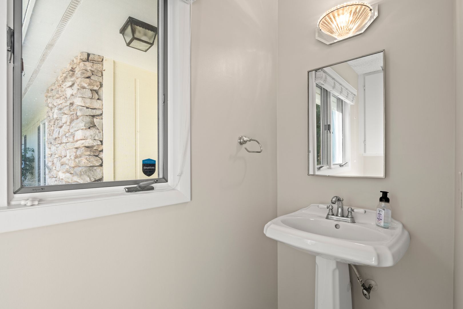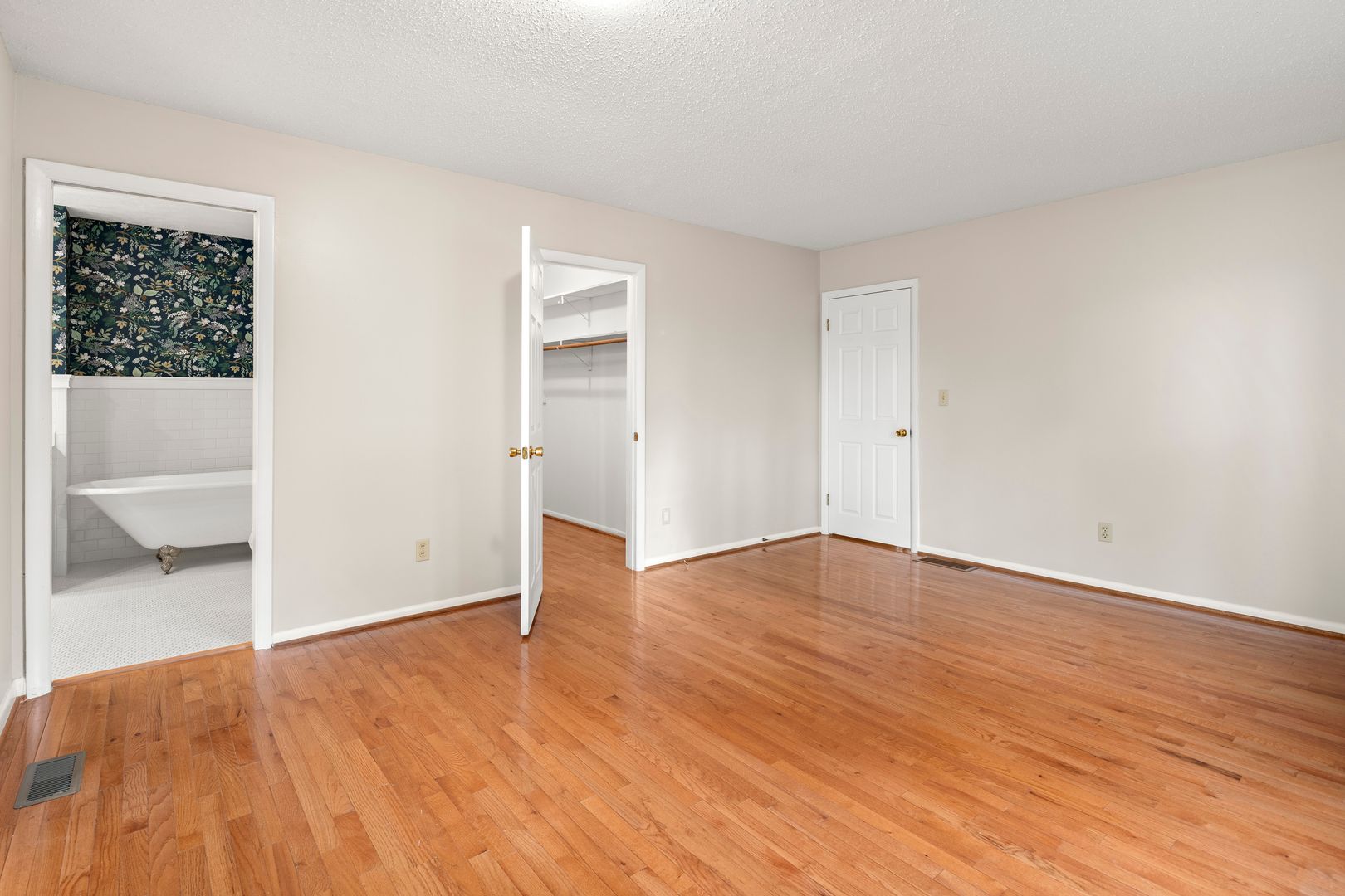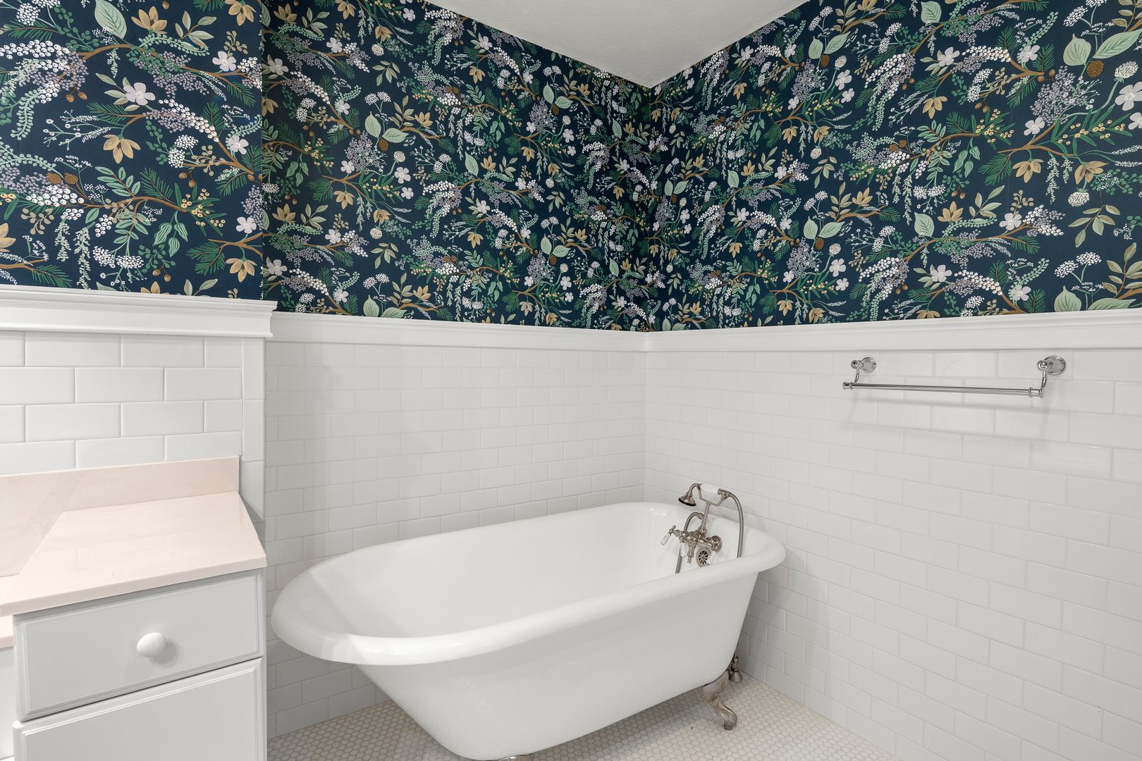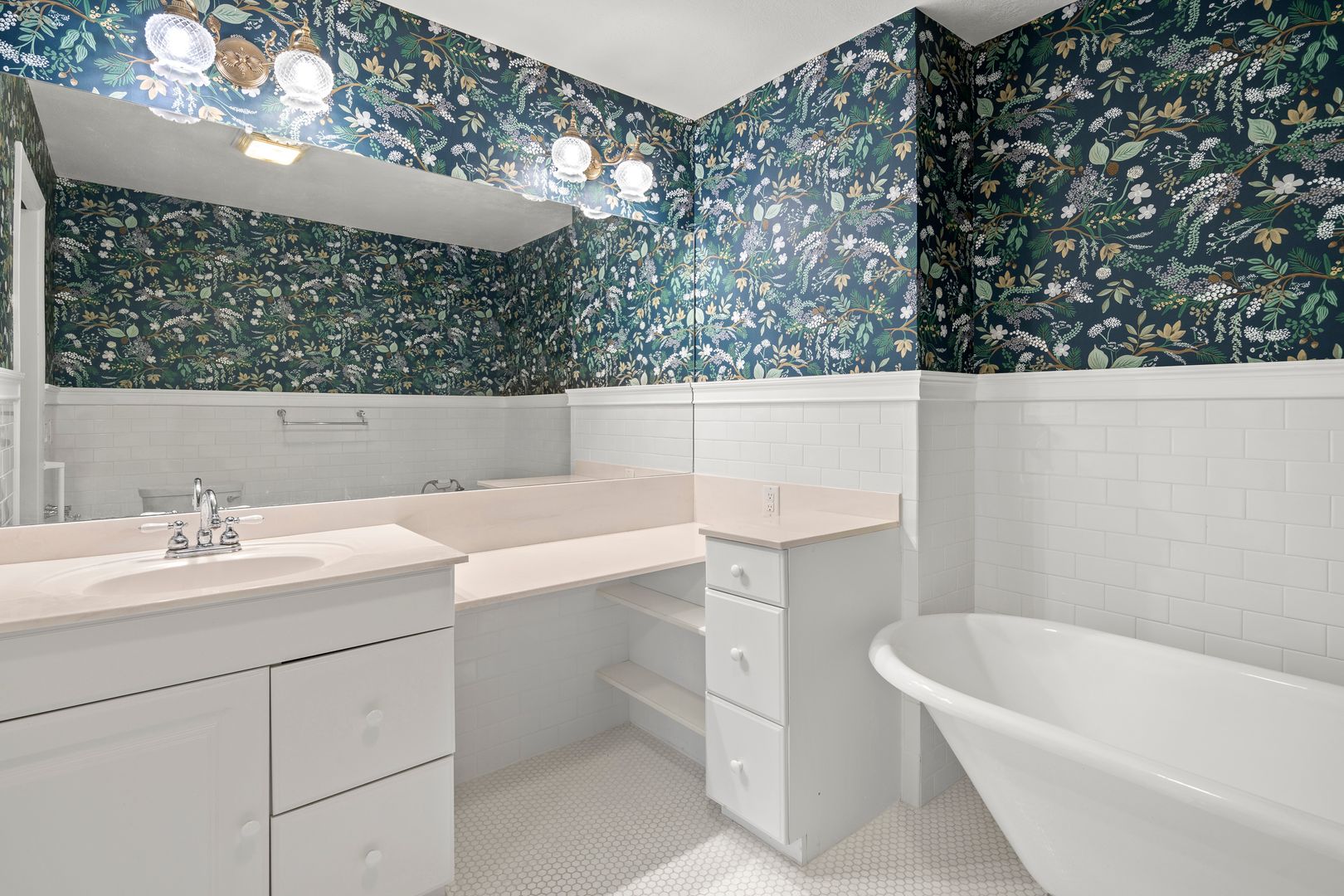 Bedrooms are accessed from the hall off of the home’s entry foyer. To the right, the primary bedroom is a true retreat with an attached sitting room, large bathroom, and walk-in closet. The spacious en suite bathroom has a claw foot tub, penny tile floors, and spa-worthy wallpaper. To the left are the remaining two bedrooms and the full hall bathroom that includes a combined shower/ bathtub.