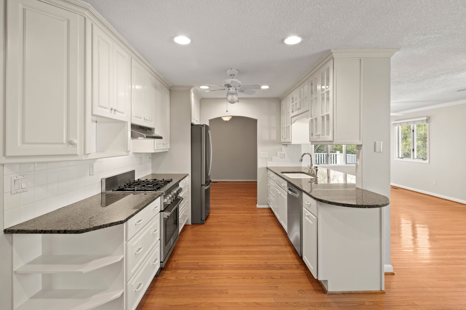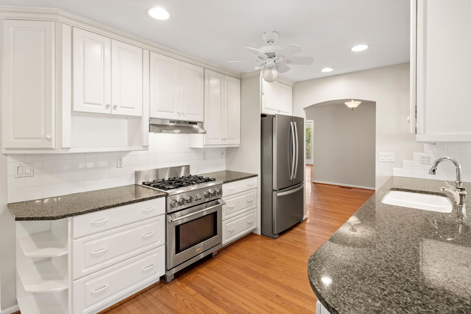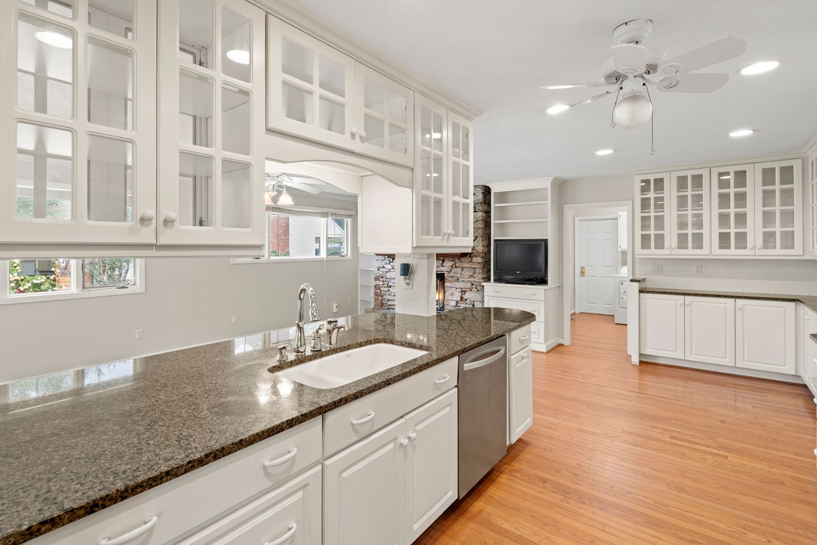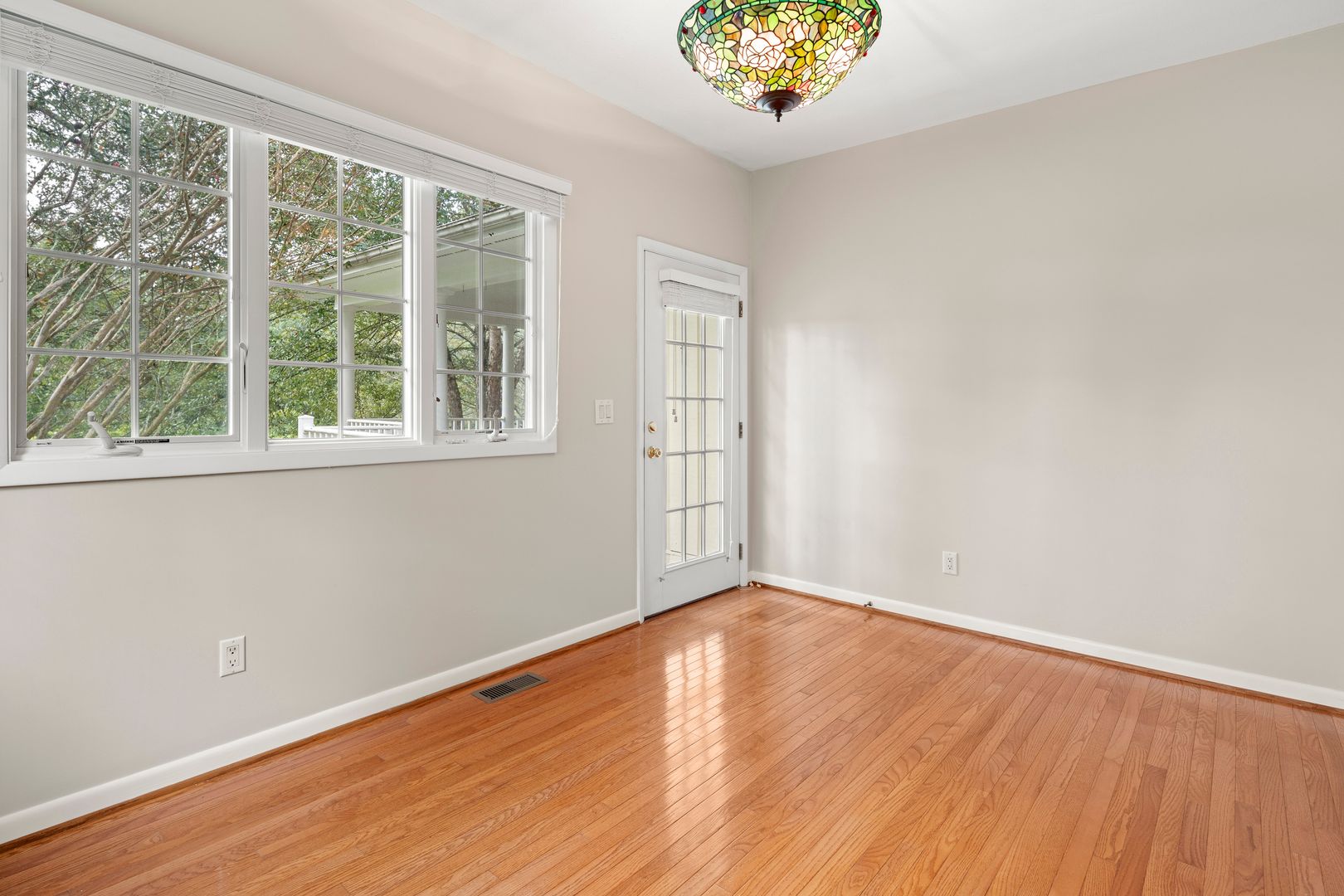 Access the spacious covered back porch from the living room, which has plentiful windows, an electric fireplace, and built-in shelving. The den is open with the kitchen and features a gas fireplace with a stacked stone surround. The kitchen has been upgraded with granite counters and nice appliances including the gas range, French door refrigerator, and dishwasher, and the formal dining room will accommodate a large dining set. Laundry, a big pantry, and the powder room are near the kitchen. The existing washer and dryer will remain for tenant use but will not be repaired or replaced by the homeowner.