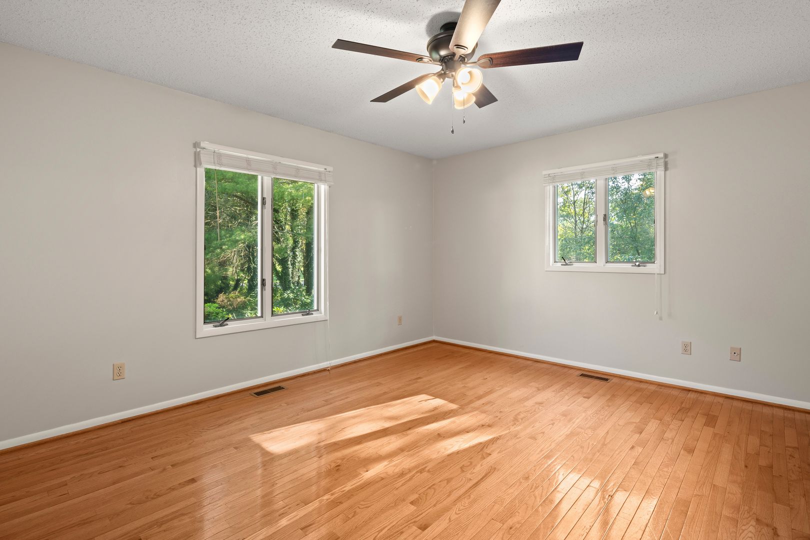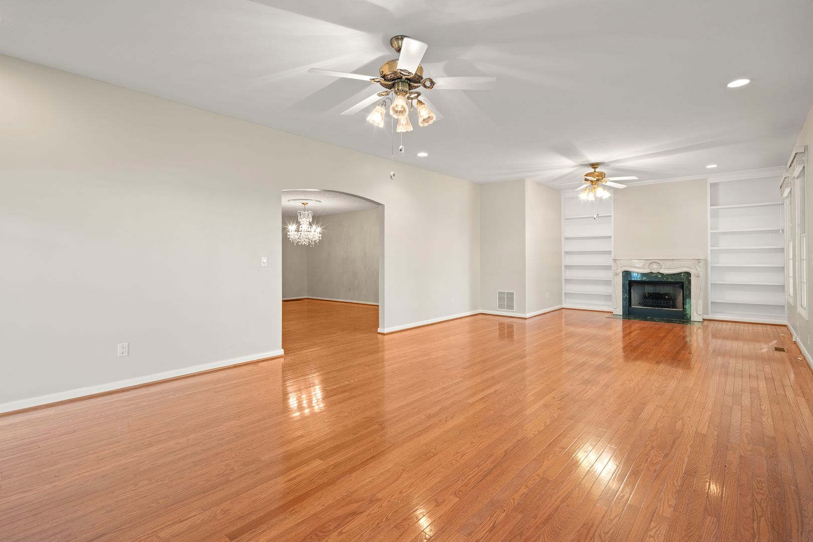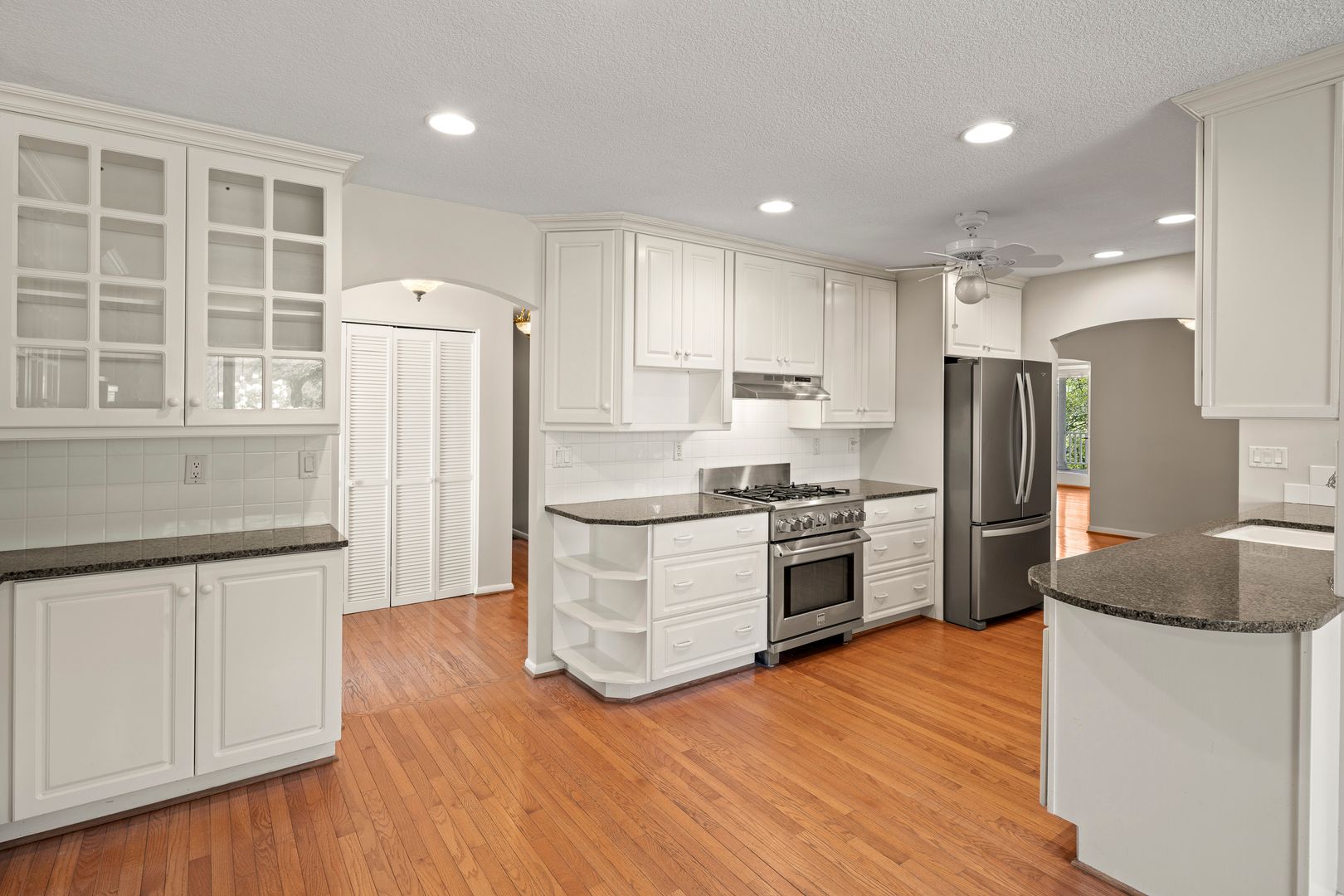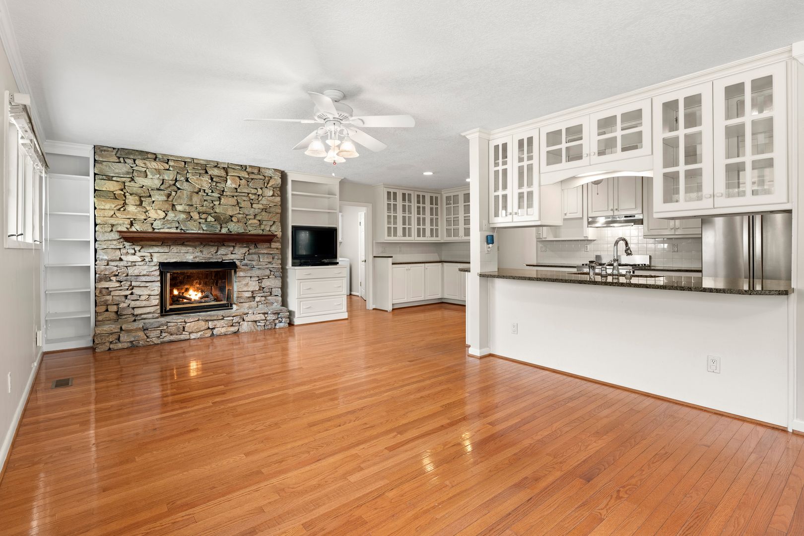 Access the spacious covered back porch from the living room, which has plentiful windows, an electric fireplace, and built-in shelving. The den is open with the kitchen and features a gas fireplace with a stacked stone surround. The kitchen has been upgraded with granite counters and nice appliances including the gas range, French door refrigerator, and dishwasher, and the formal dining room will accommodate a large dining set. Laundry, a big pantry, and the powder room are near the kitchen. The existing washer and dryer will remain for tenant use but will not be repaired or replaced by the homeowner.