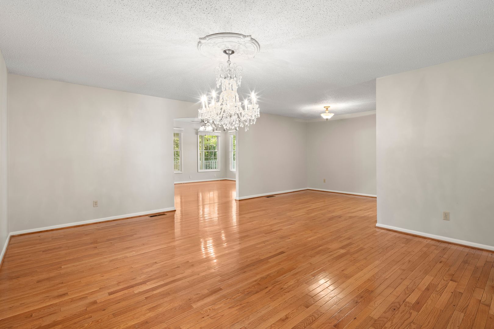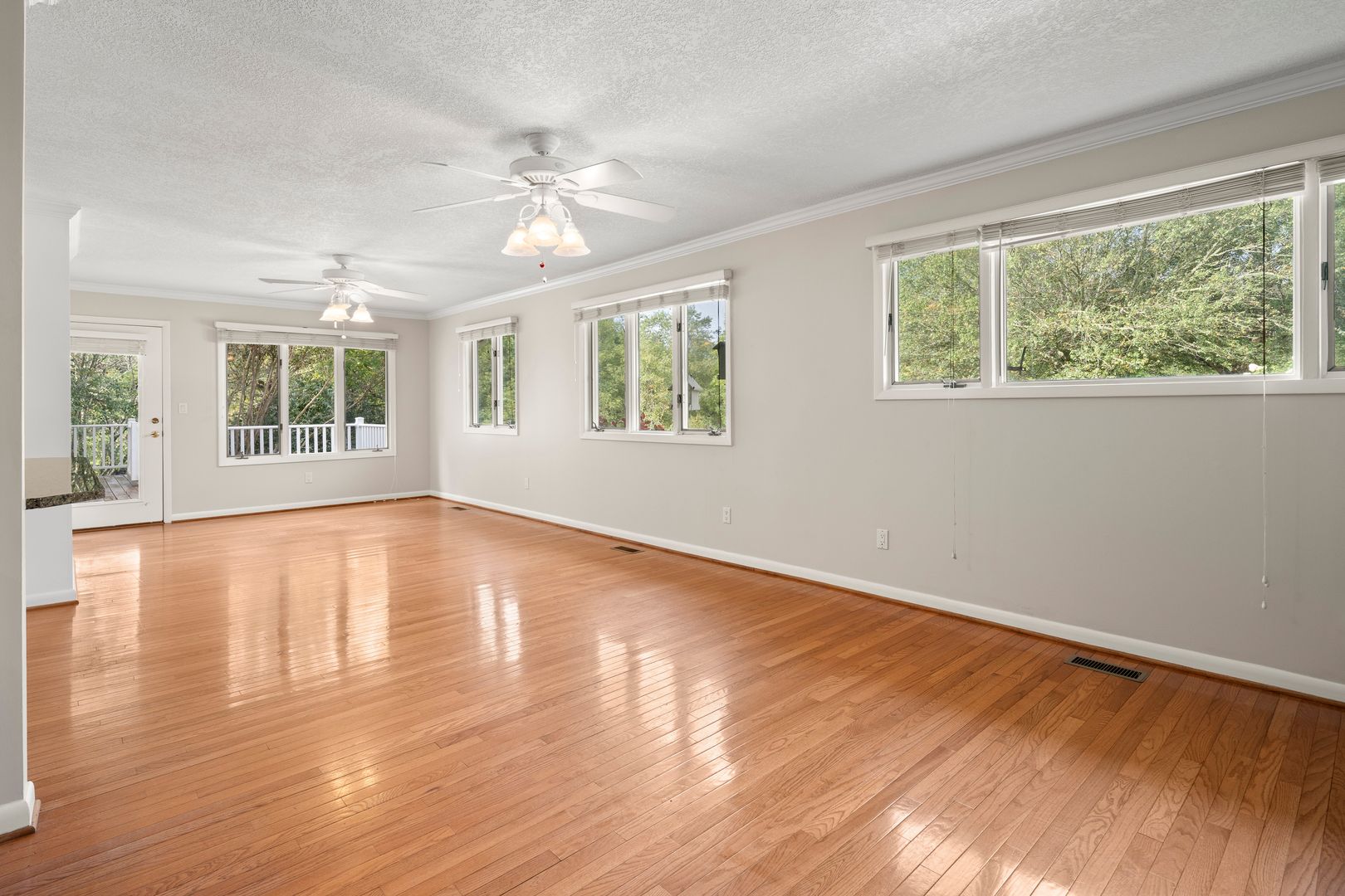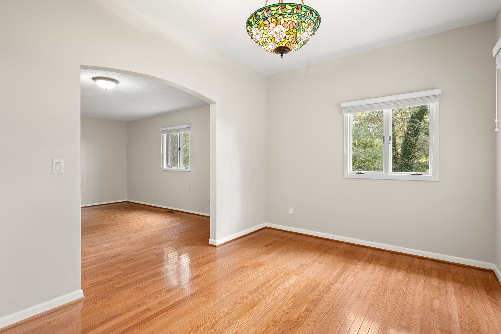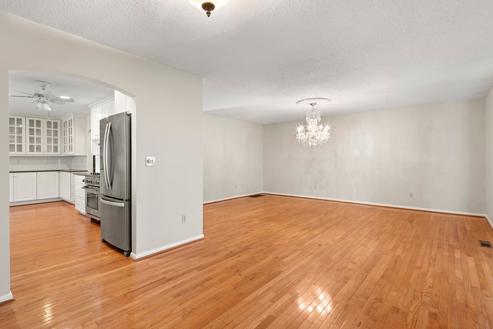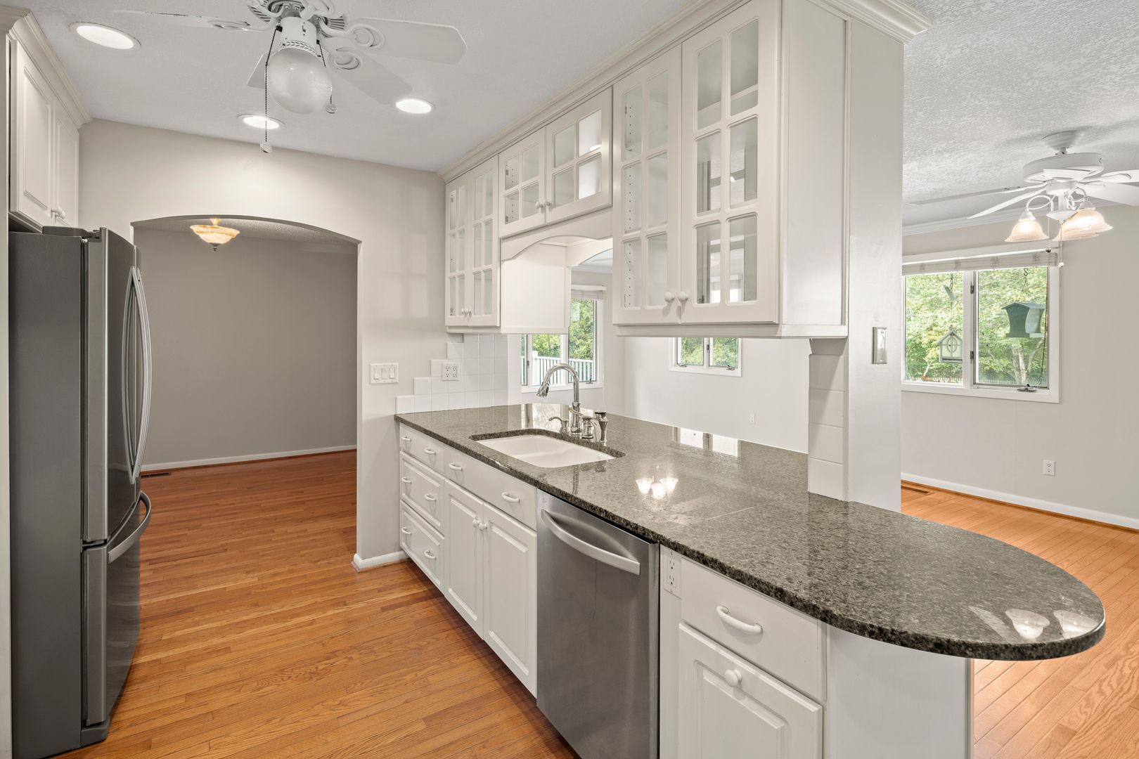 Access the spacious covered back porch from the living room, which has plentiful windows, an electric fireplace, and built-in shelving. The den is open with the kitchen and features a gas fireplace with a stacked stone surround. The kitchen has been upgraded with granite counters and nice appliances including the gas range, French door refrigerator, and dishwasher, and the formal dining room will accommodate a large dining set. Laundry, a big pantry, and the powder room are near the kitchen. The existing washer and dryer will remain for tenant use but will not be repaired or replaced by the homeowner.