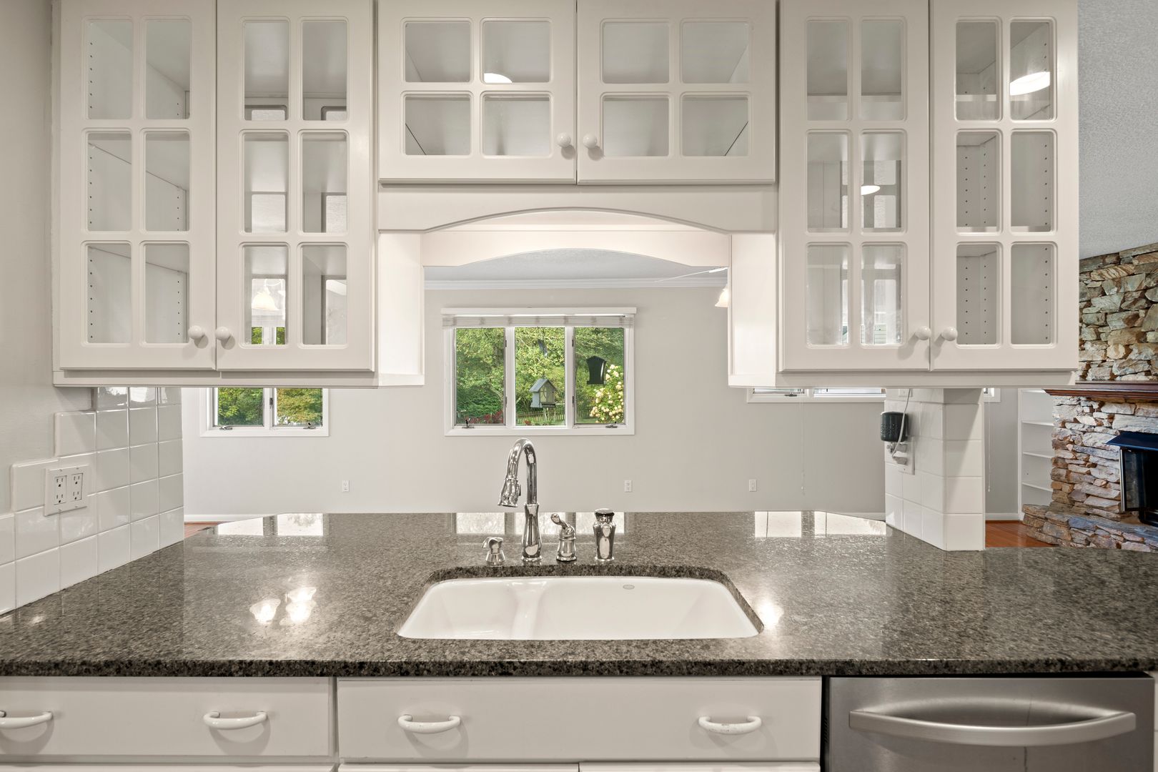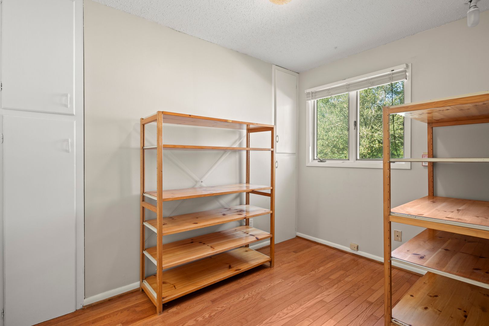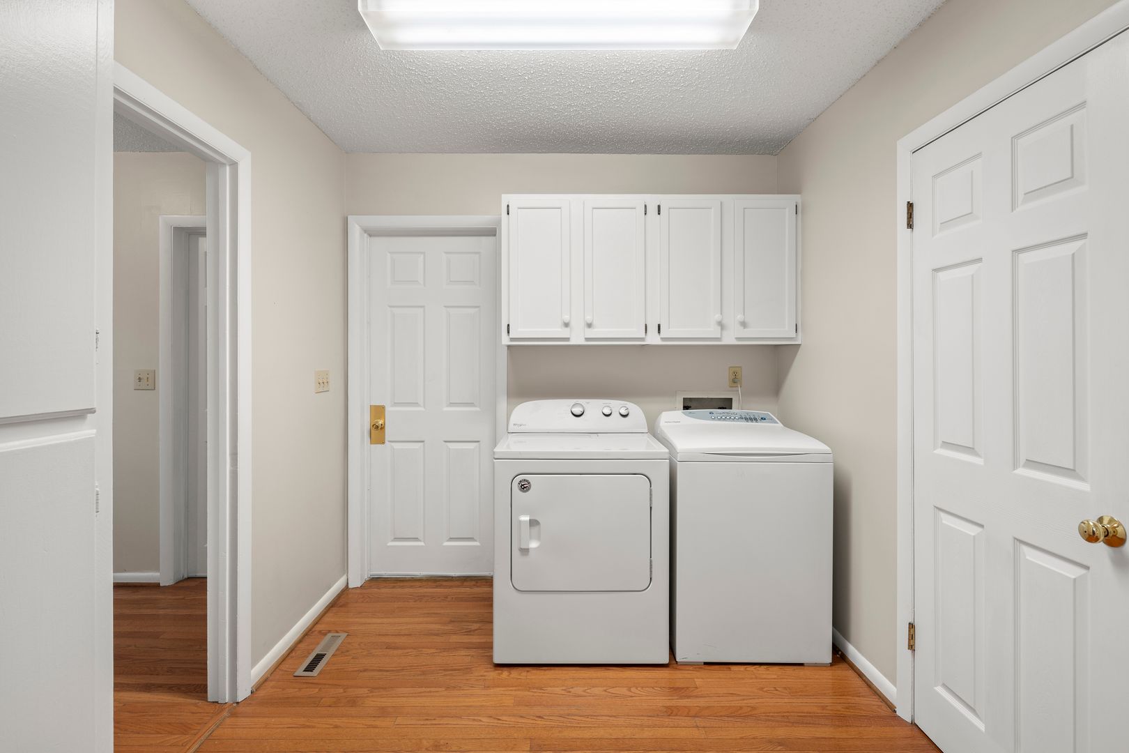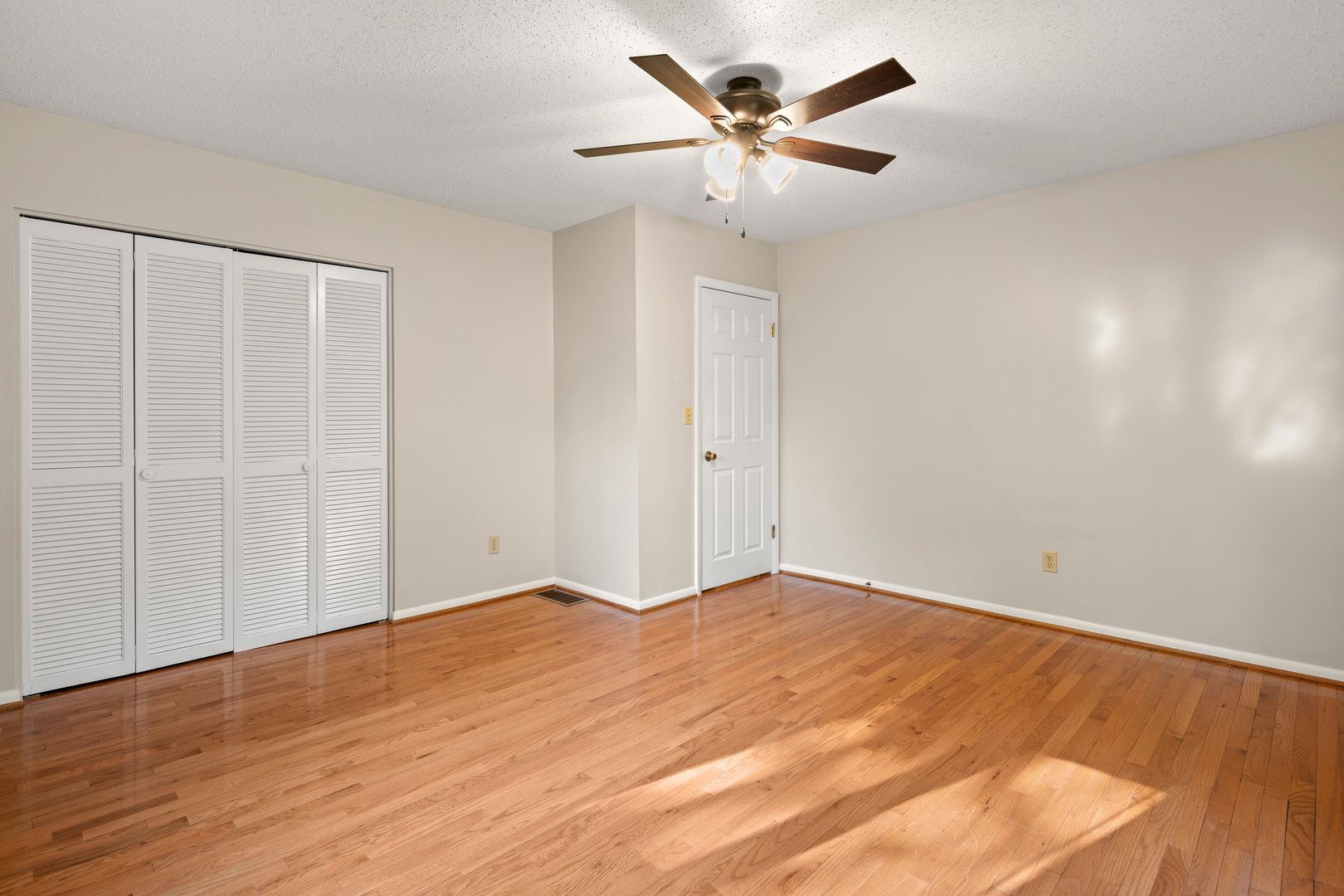 Access the spacious covered back porch from the living room, which has plentiful windows, an electric fireplace, and built-in shelving. The den is open with the kitchen and features a gas fireplace with a stacked stone surround. The kitchen has been upgraded with granite counters and nice appliances including the gas range, French door refrigerator, and dishwasher, and the formal dining room will accommodate a large dining set. Laundry, a big pantry, and the powder room are near the kitchen. The existing washer and dryer will remain for tenant use but will not be repaired or replaced by the homeowner.