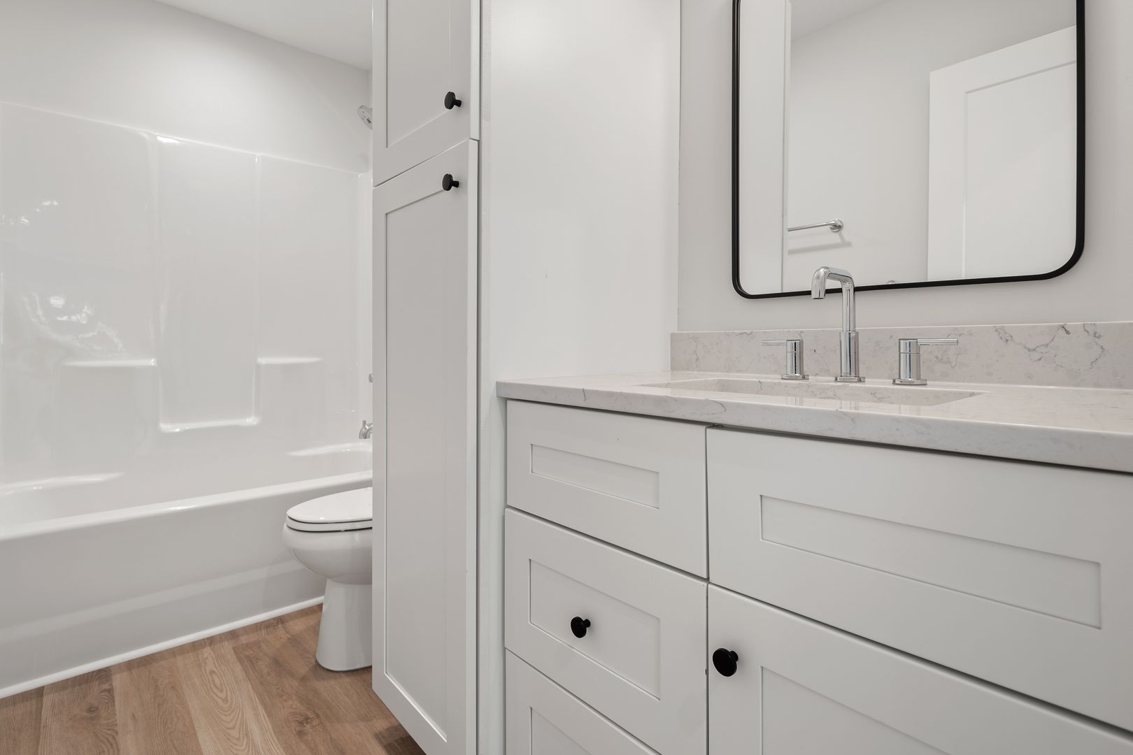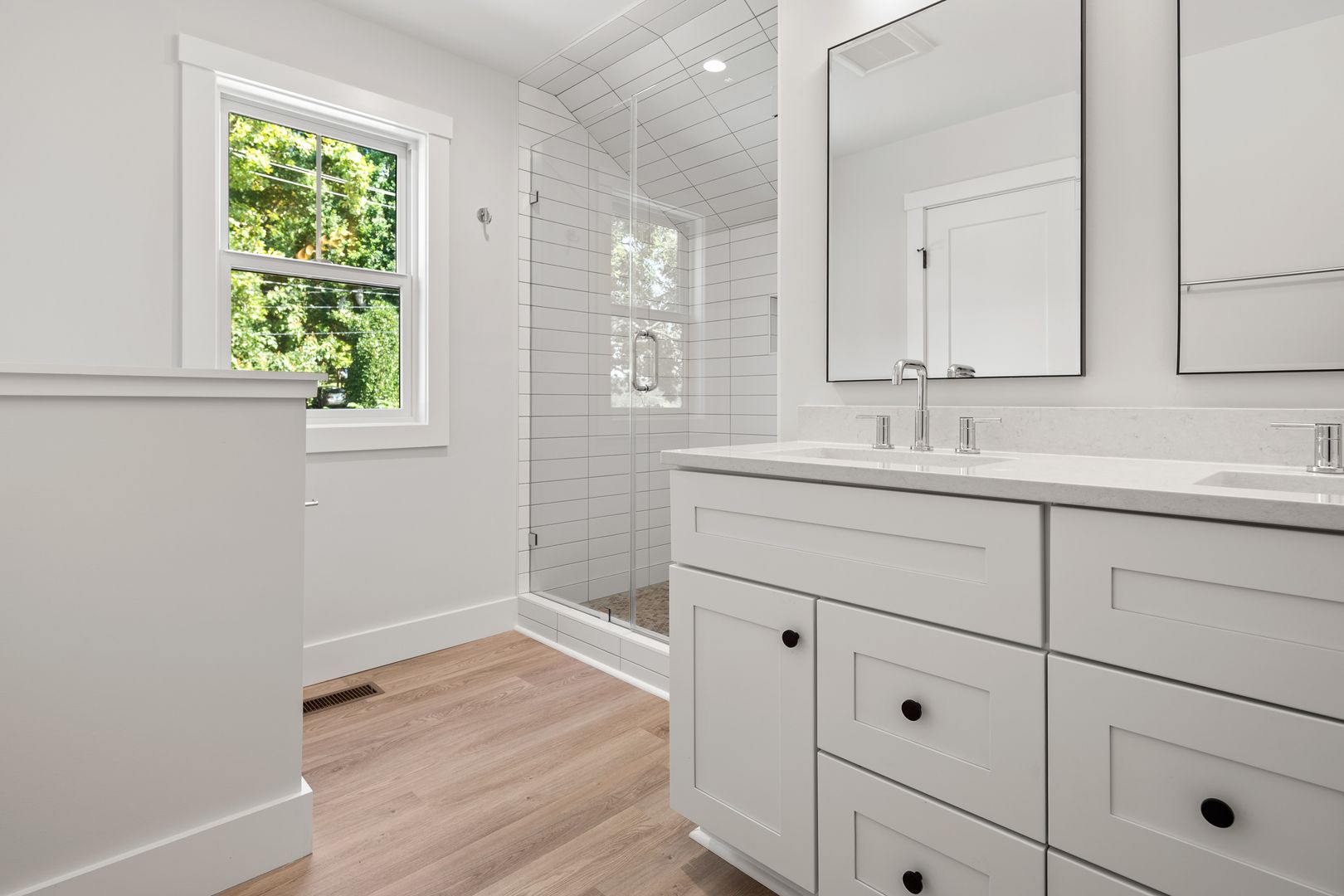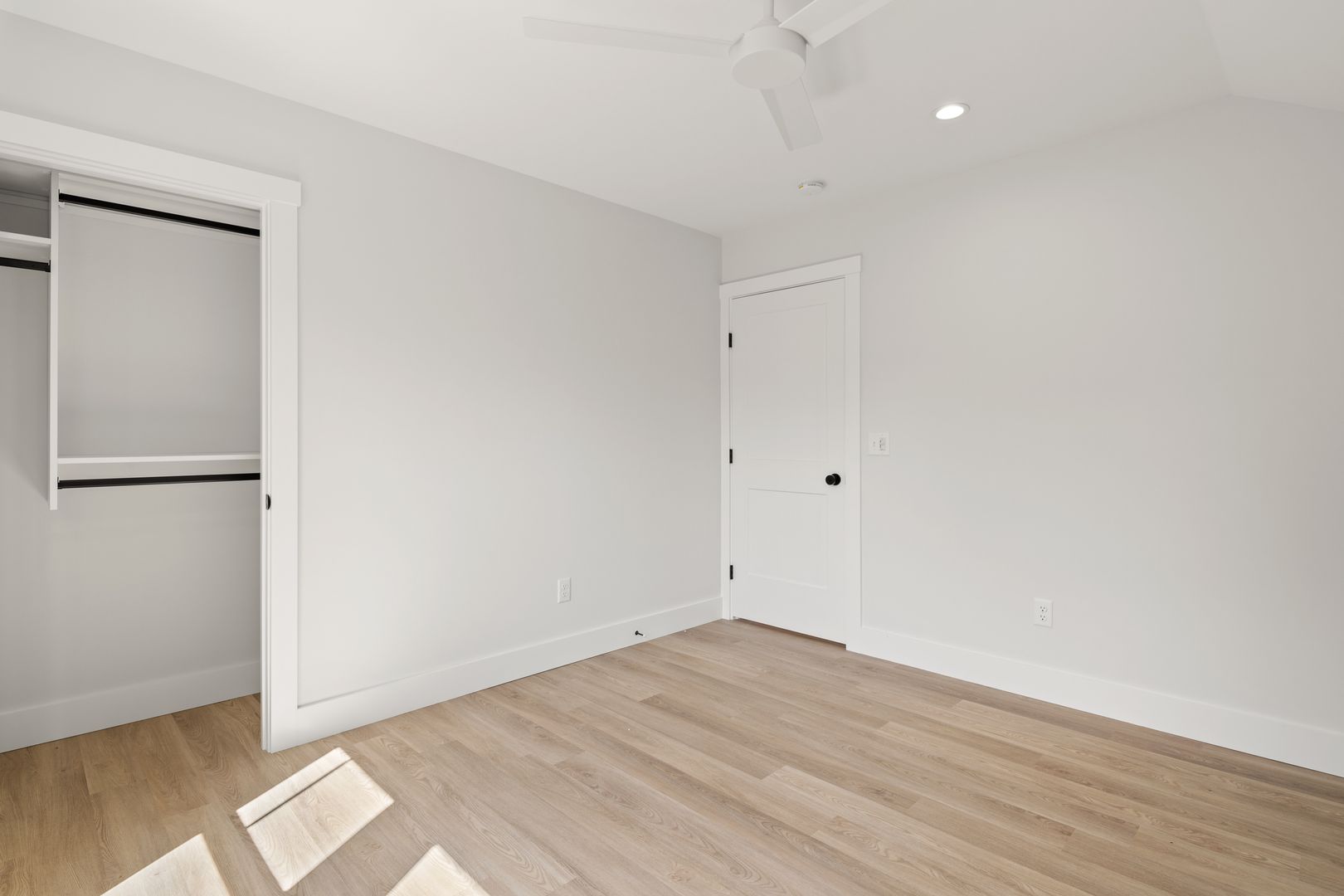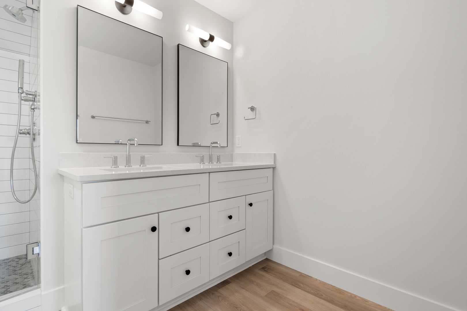 Upstairs are all three bedrooms and both full bathrooms. The primary bedroom suite offers a walk-in closet with a robust shelving system and a beautiful en suite bathroom with a double-sink vanity and tiled walk-in shower. The second full bathroom includes a combination bathtub/shower and great storage.