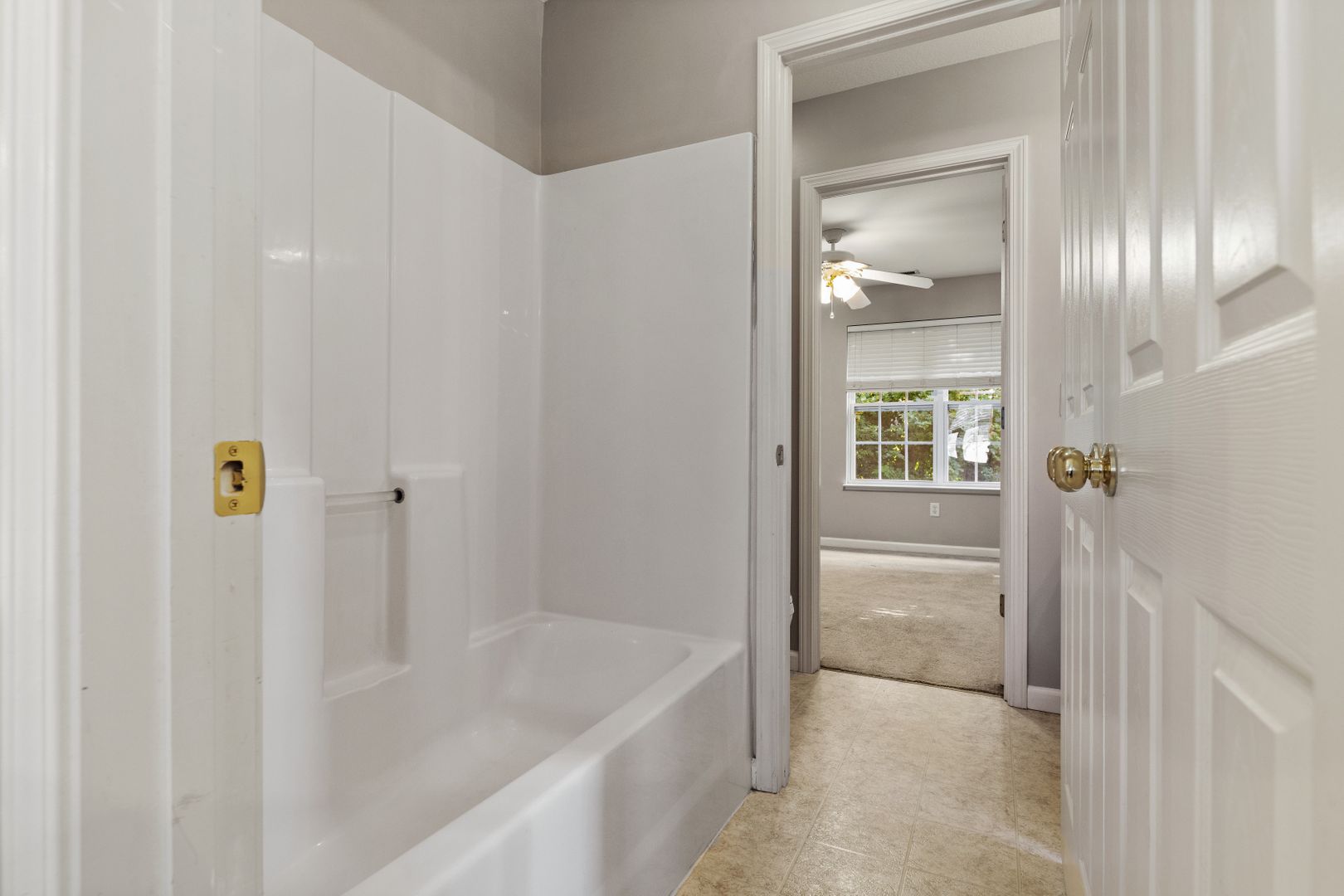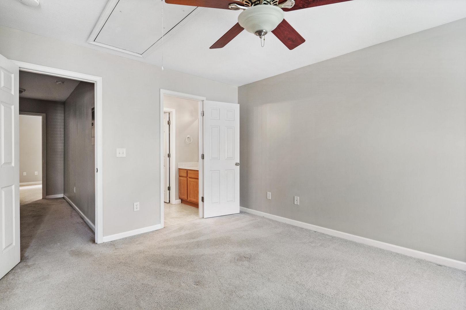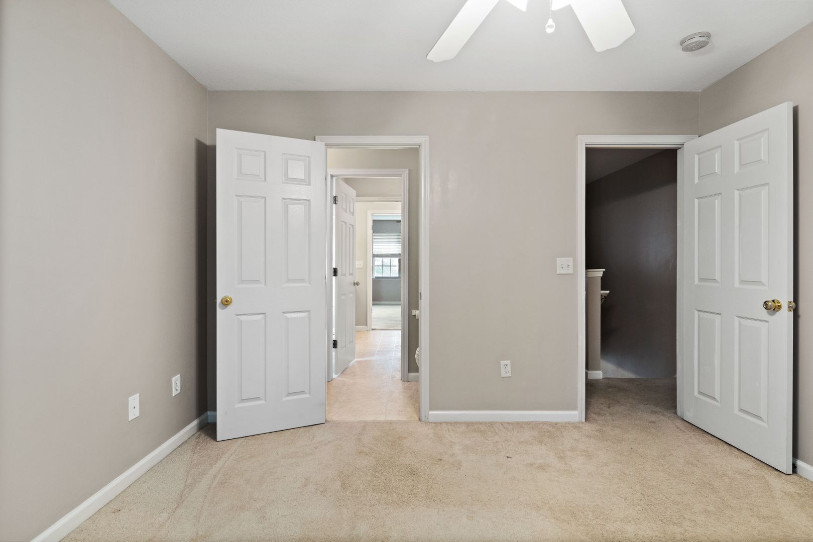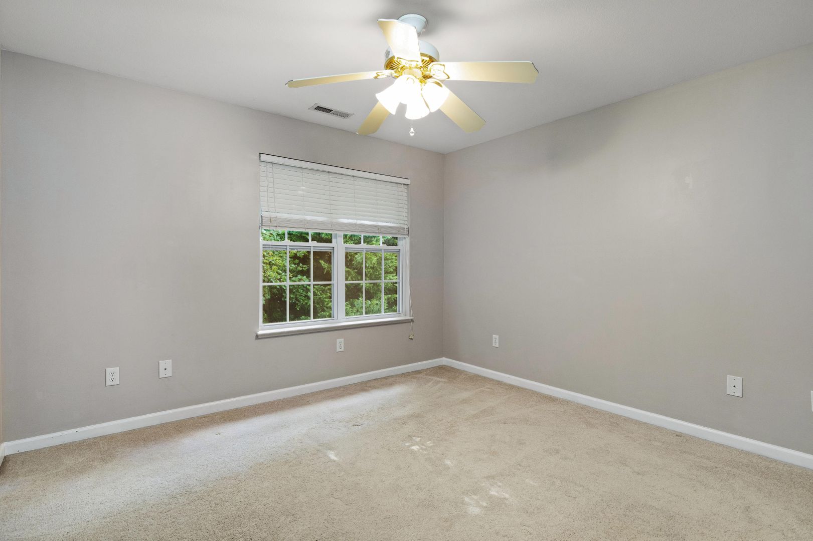 The main floor includes the living room with ceiling fans, the half bathroom, and the eat-in kitchen with great cabinet and counter space. Appliances include the electric range, microwave, refrigerator, and dishwasher. French doors open to the back patio. The laundry closet is in the kitchen - please note the pictured washer and dryer are not included. Upstairs are two spacious bedrooms with ceiling fans and a Jack and Jill bathroom, which includes a double vanity on the primary bedroom side, a separate vanity/ water closet next to the guest bedroom, and the bathtub/shower in between. Bedrooms are carpeted. Central heat and air conditioning. Tenant responsible for all utilities including electricity, water/sewer, and natural gas. Trash collection is provided by the Town of Fletcher. One parking space included and limited guest parking available. No smoking. No cosigners. No pets.
