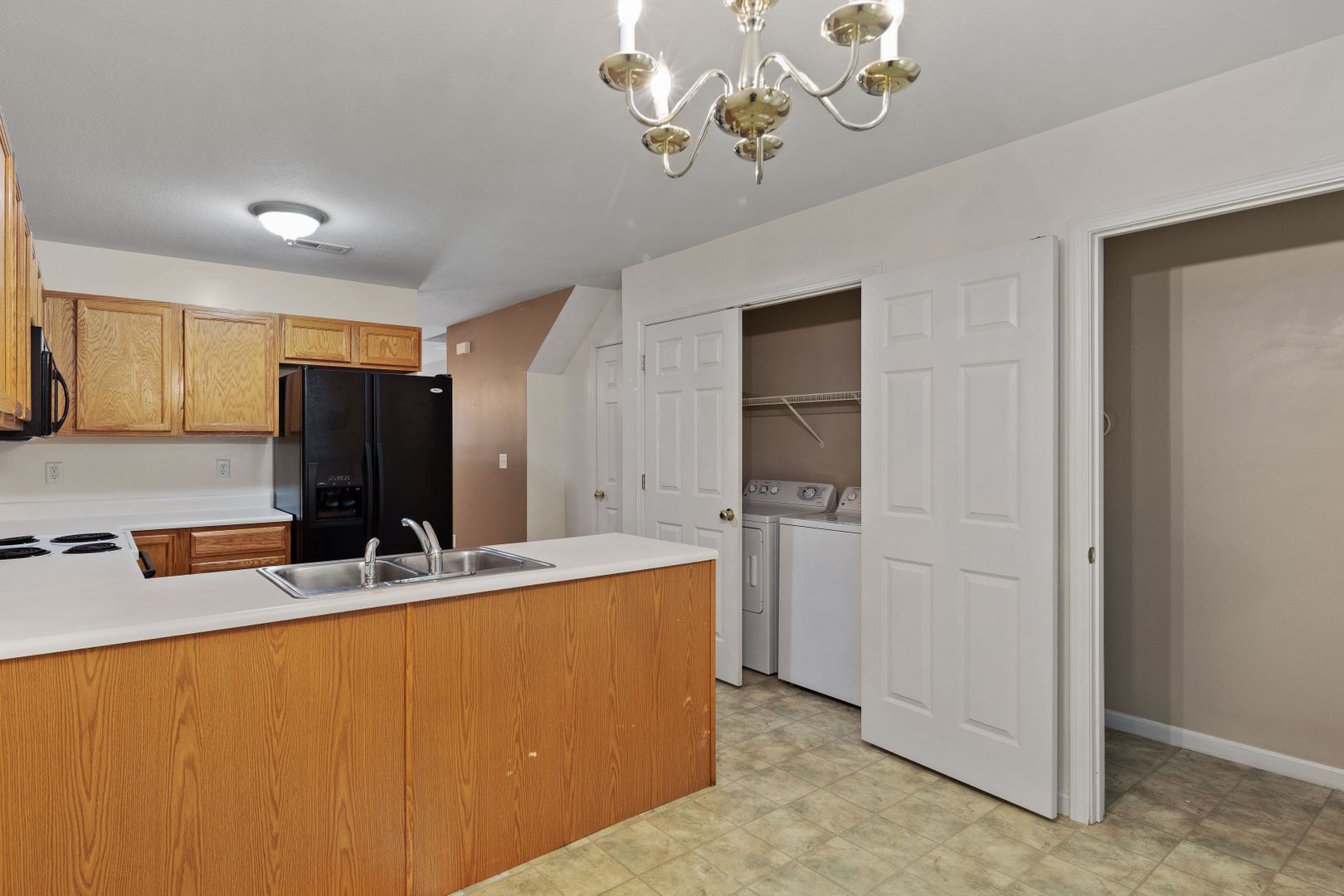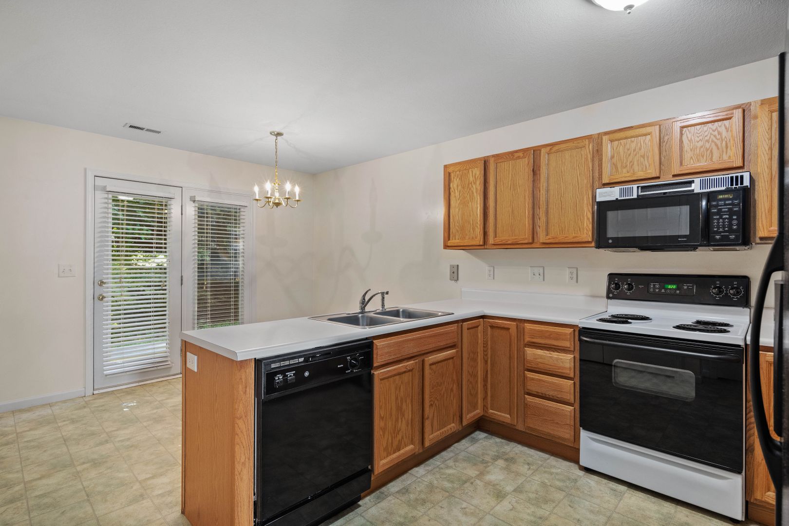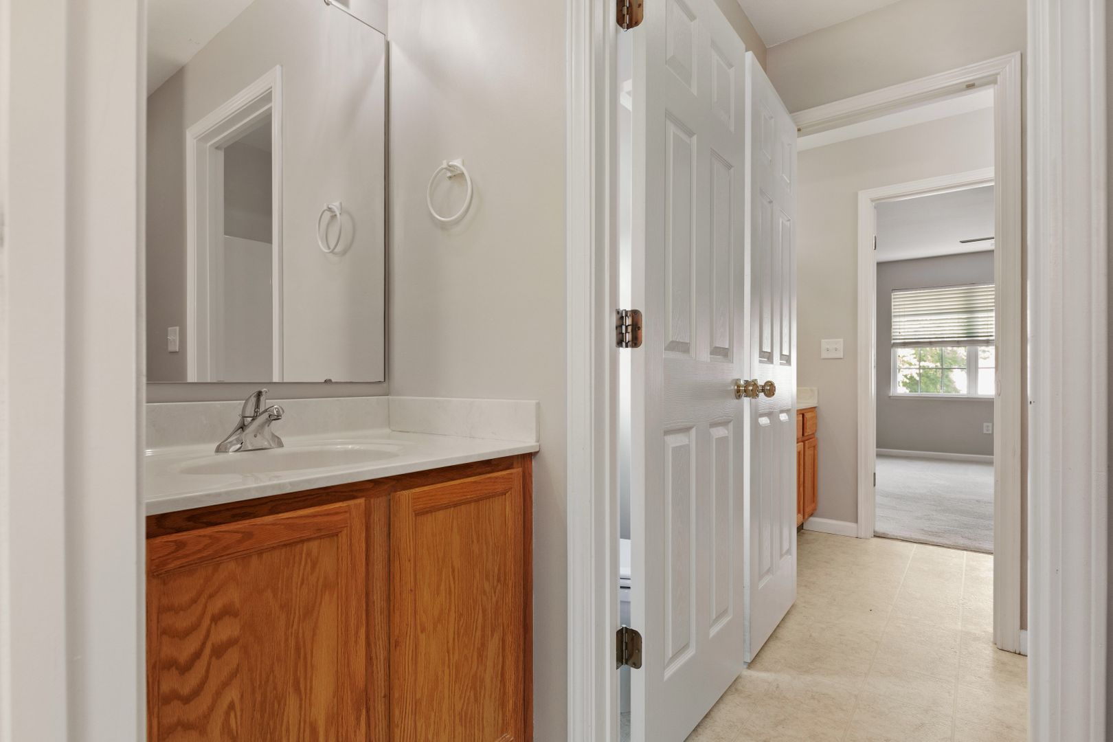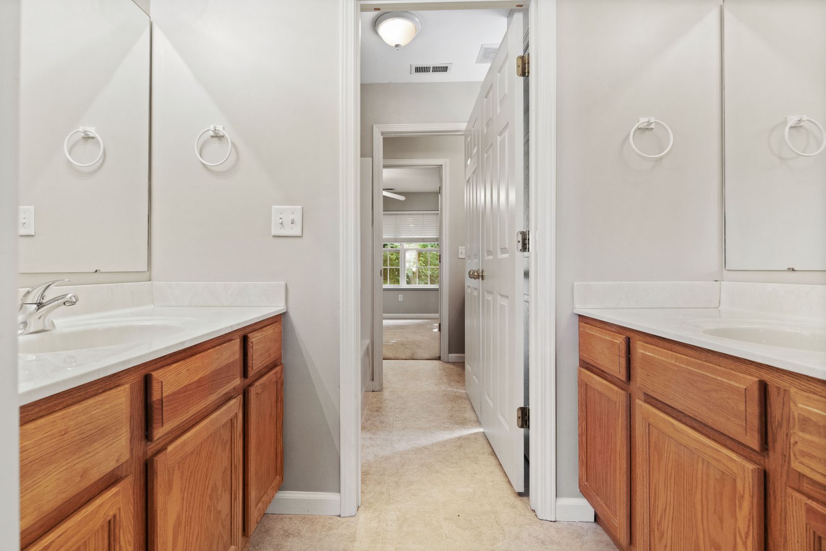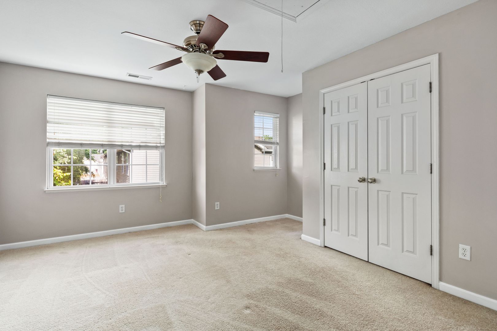 The main floor includes the living room with ceiling fans, the half bathroom, and the eat-in kitchen with great cabinet and counter space. Appliances include the electric range, microwave, refrigerator, and dishwasher. French doors open to the back patio. The laundry closet is in the kitchen - please note the pictured washer and dryer are not included. Upstairs are two spacious bedrooms with ceiling fans and a Jack and Jill bathroom, which includes a double vanity on the primary bedroom side, a separate vanity/ water closet next to the guest bedroom, and the bathtub/shower in between. Bedrooms are carpeted. Central heat and air conditioning. Tenant responsible for all utilities including electricity, water/sewer, and natural gas. Trash collection is provided by the Town of Fletcher. One parking space included and limited guest parking available. No smoking. No cosigners. No pets.