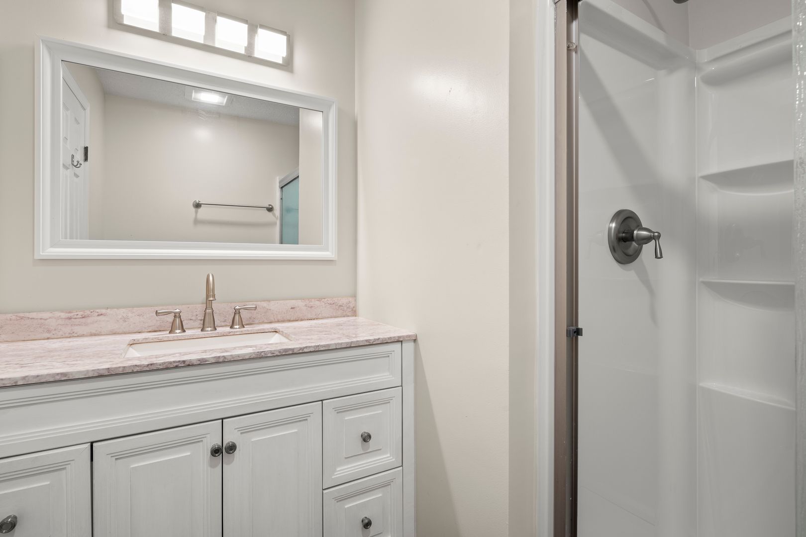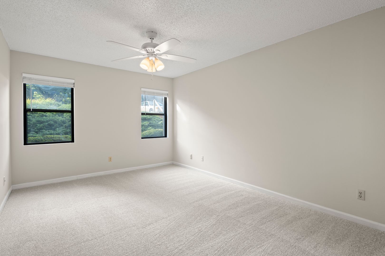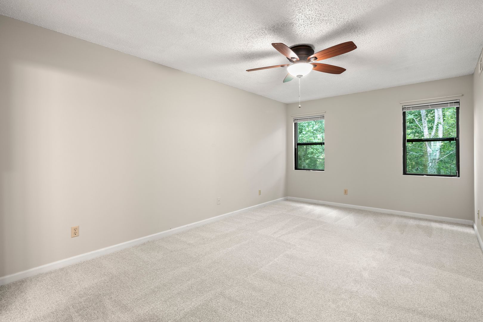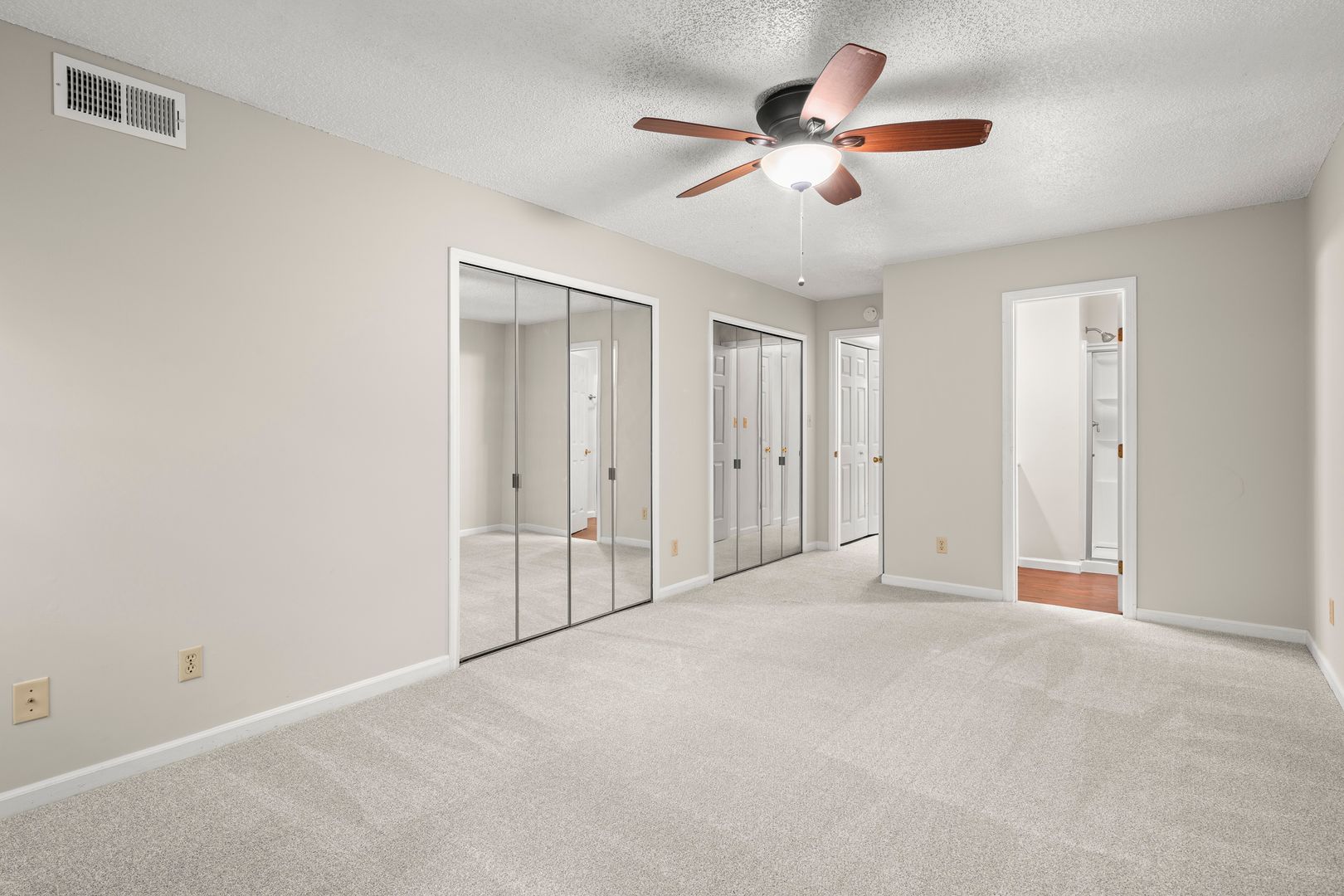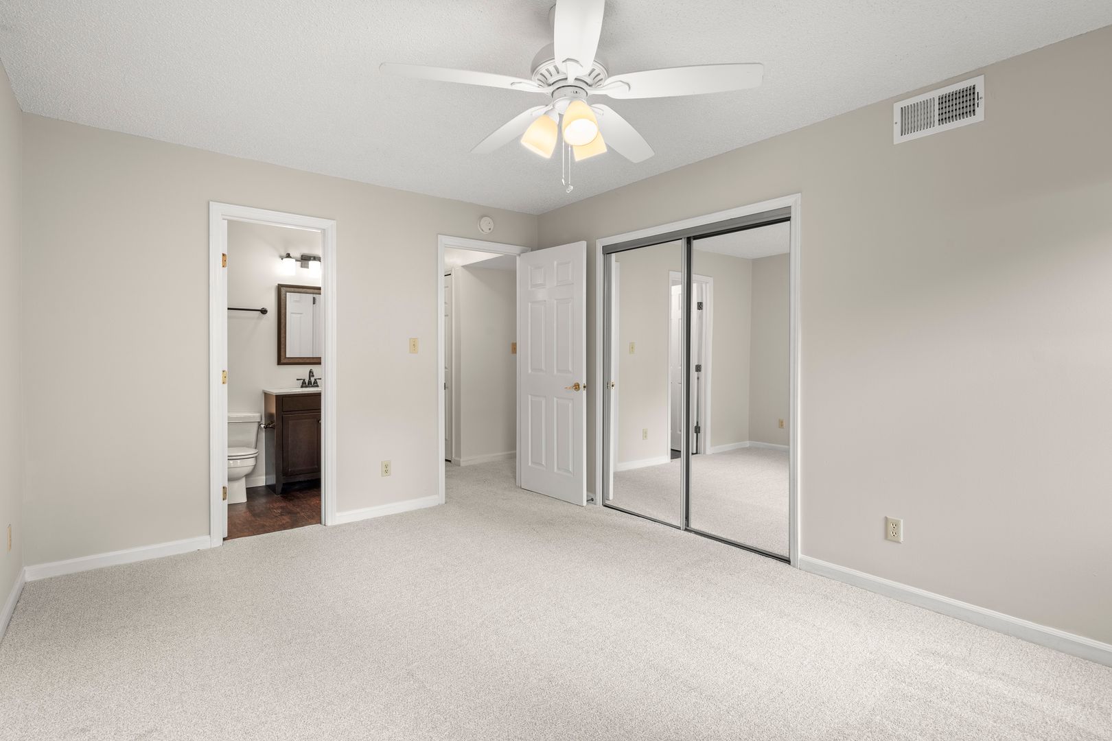 Each bedroom includes a ceiling fan, good closet space, and bathroom access. The primary bedroom includes two closets and an en suite bathroom with a shower and a large single-sink vanity. The second bathroom has a combination shower/ bathtub and doors for access from the second bedroom and from the hall. The washer and dryer installed in the hall laundry closet will remain for tenant use but will not be repaired or replaced by the homeowner.