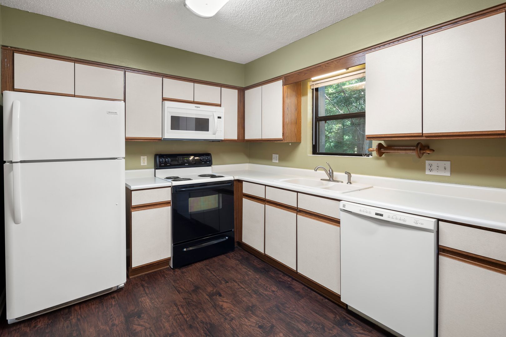 The living room features a cozy gas fireplace and sliding doors to a screened porch with a ceiling fan, storage closet, and nice wooded views. The formal dining room is separated by a partial wall, and there's a small breakfast nook in the kitchen. Kitchen appliances include the dishwasher, refrigerator, and built-in microwave. The NEW Whirlpool electric range is not yet reflected in photos.