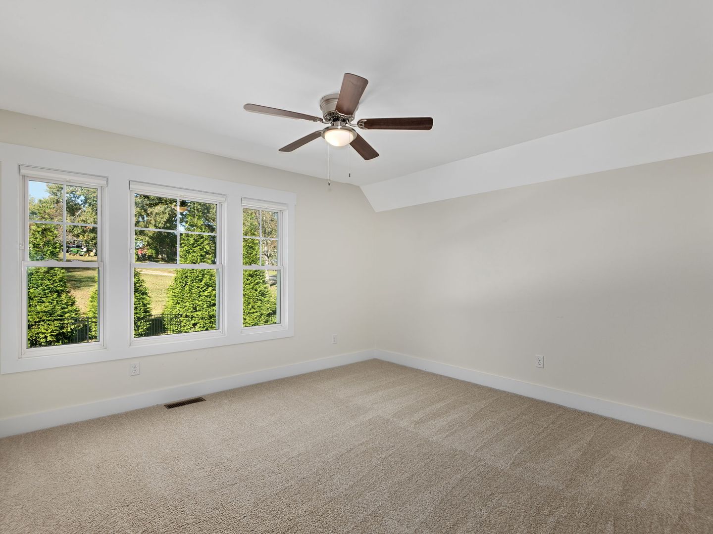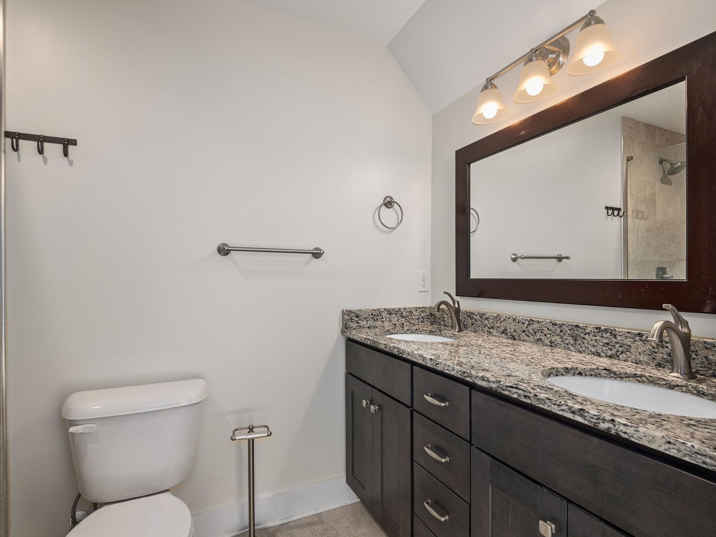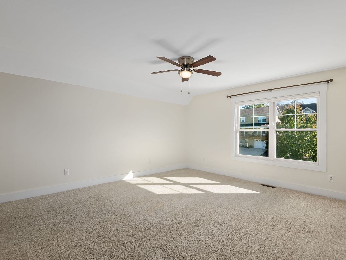 Upstairs are the three bedrooms and both full bathrooms. The primary bedroom suite includes a walk-in closet and an en suite bathroom with a large tiled shower and two-sink vanity. The hall bathroom has a combination shower/ bathtub and a roomy vanity. Each bedroom is carpeted and includes a ceiling fan.