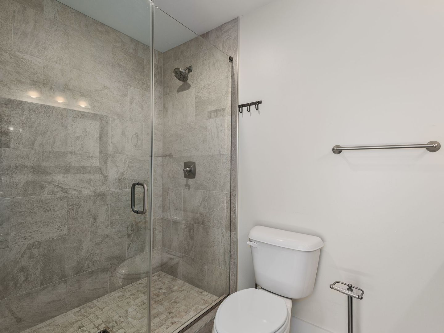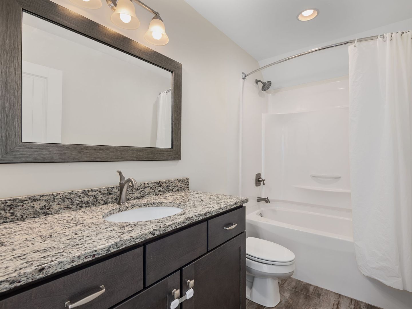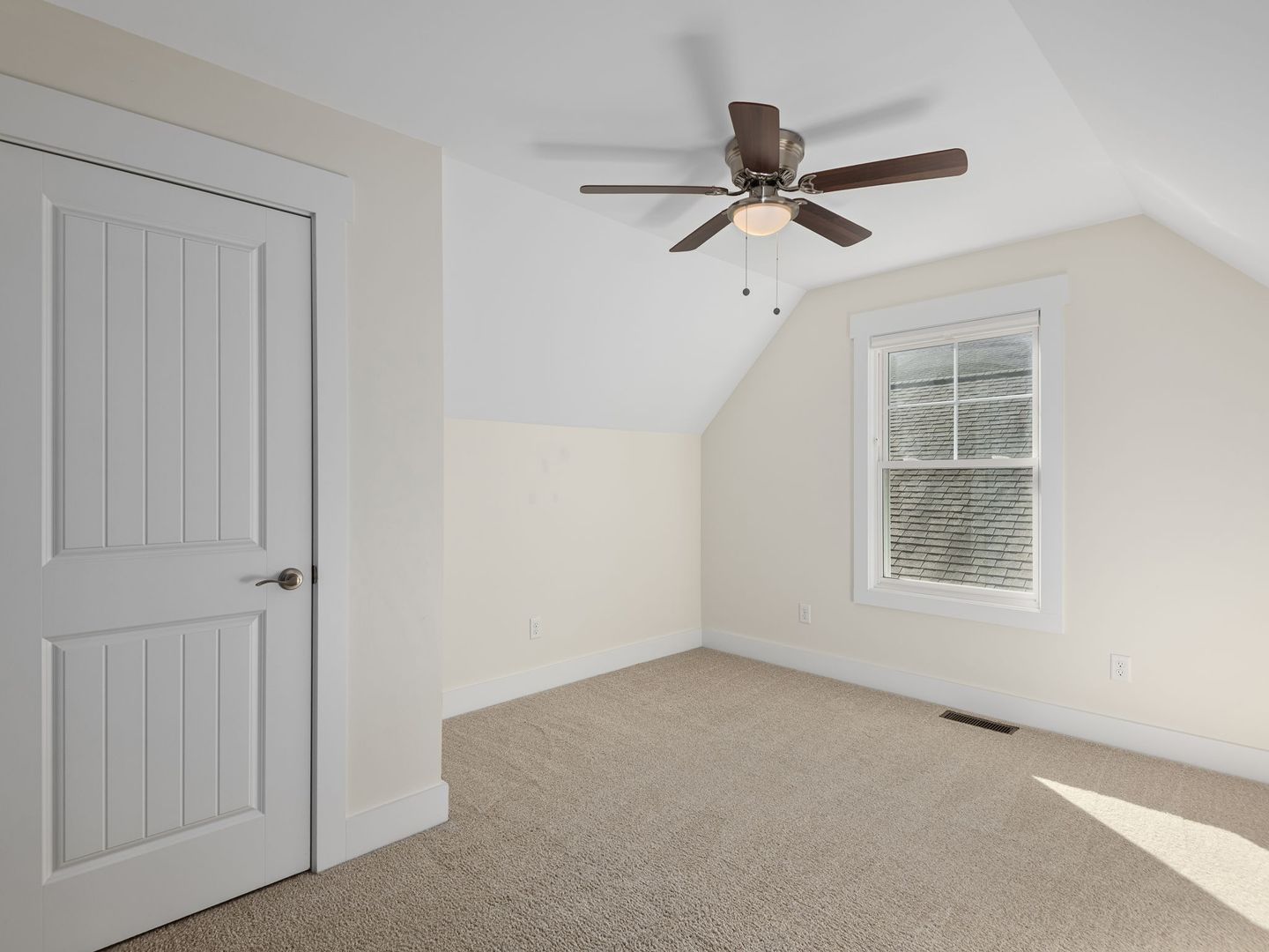 Upstairs are the three bedrooms and both full bathrooms. The primary bedroom suite includes a walk-in closet and an en suite bathroom with a large tiled shower and two-sink vanity. The hall bathroom has a combination shower/ bathtub and a roomy vanity. Each bedroom is carpeted and includes a ceiling fan.