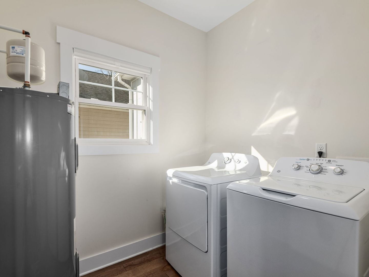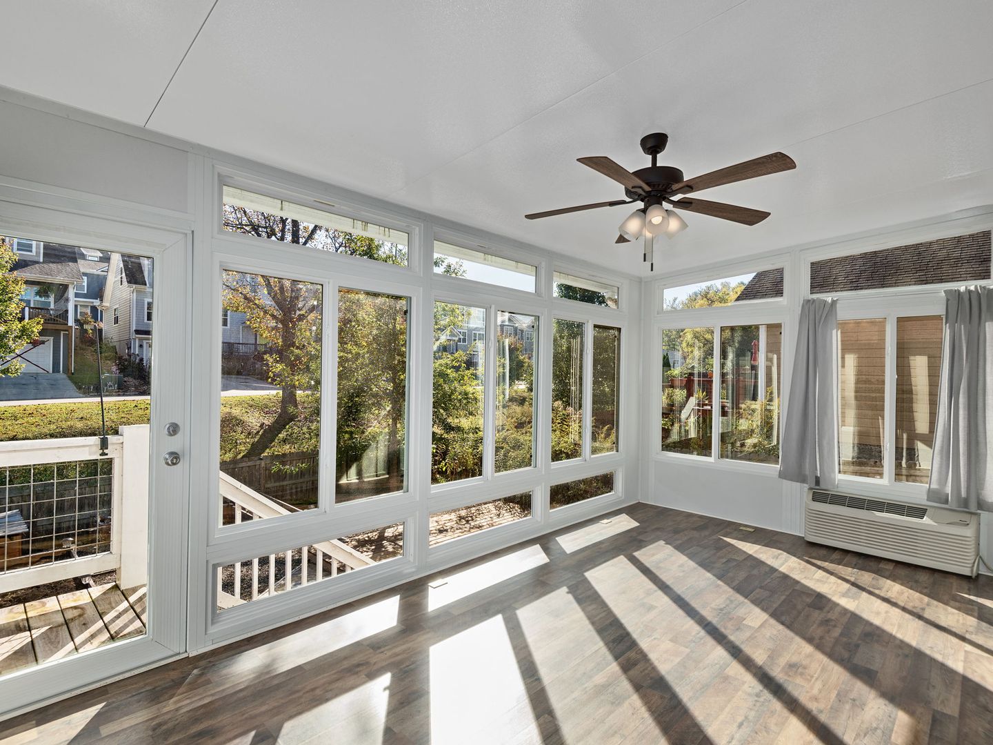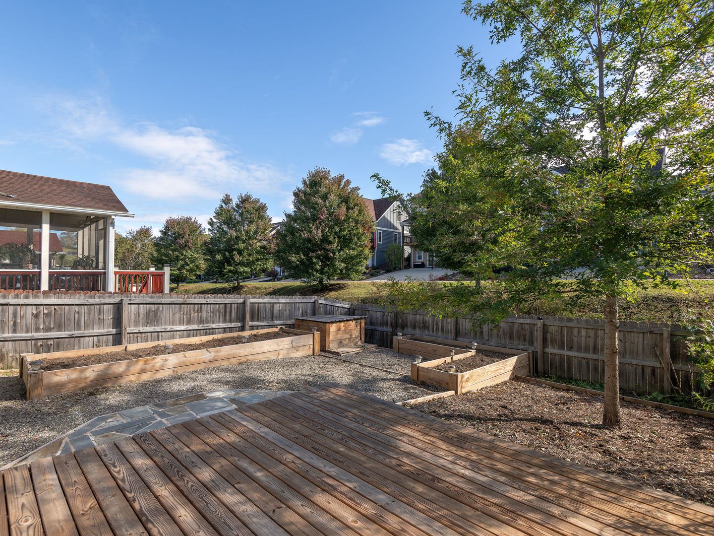 The open plan great room features a gas fireplace, plentiful recessed lighting, and pretty hardwood floors, with sleek shaker-style cabinets and granite countertops in the kitchen. Appliances include the refrigerator, gas range, microwave, and dishwasher. Off of the kitchen find the pantry, powder room, and laundry room with washer and dryer included. Enjoy great additional living space in the all-season sun room. A mini-split system provides thermostat controlled heating and air conditioning for this space. The fully fenced backyard is the perfect space to gather, grill, and garden with decking, flagstone paths, and raised beds.
