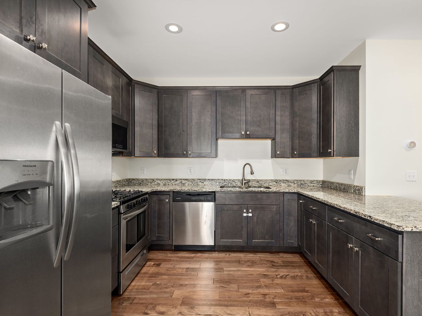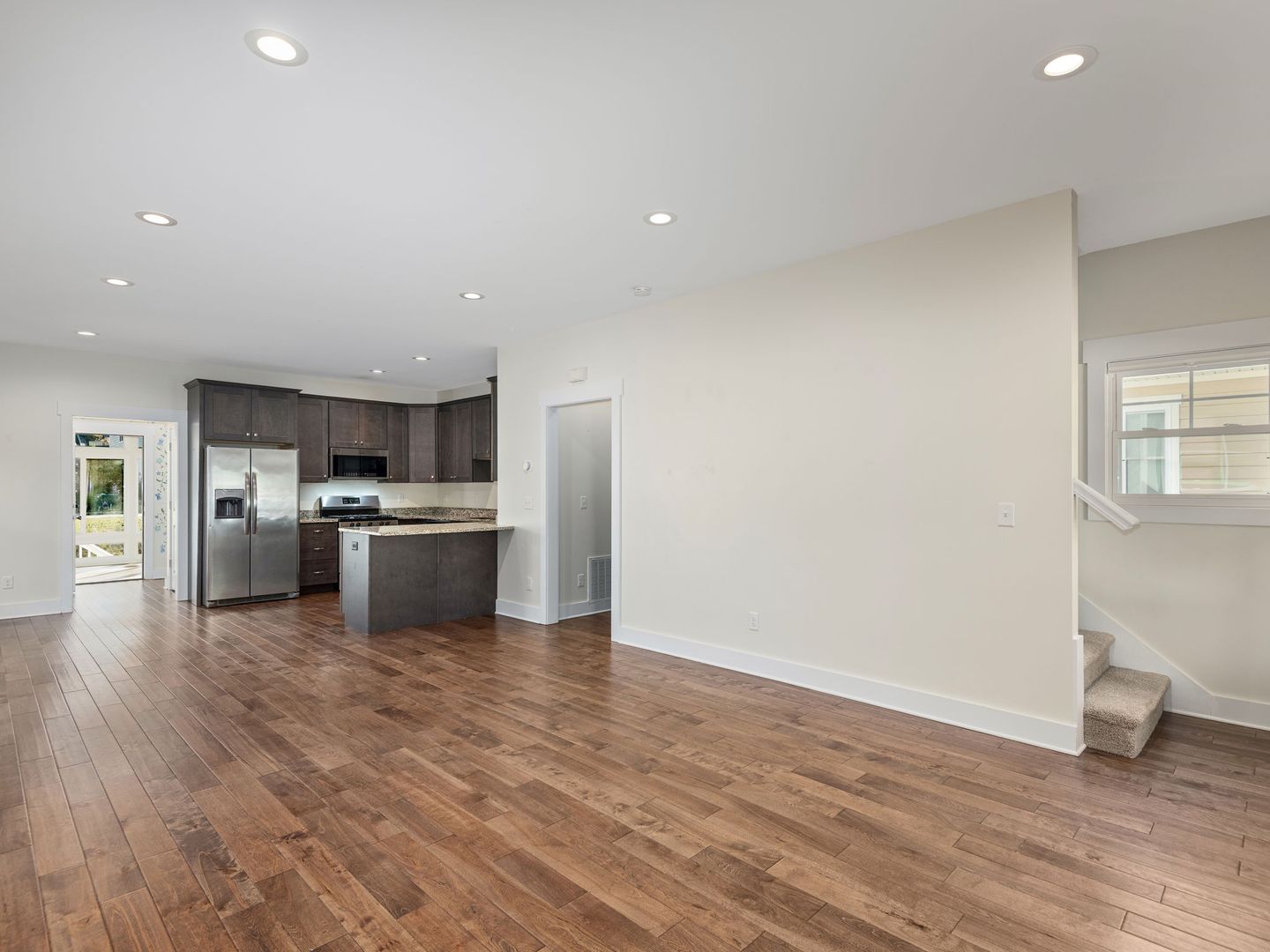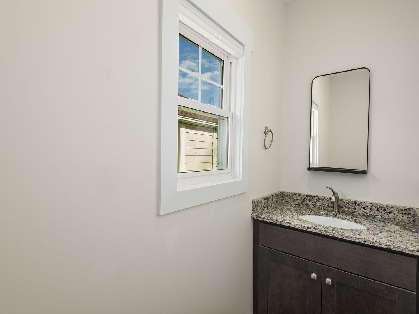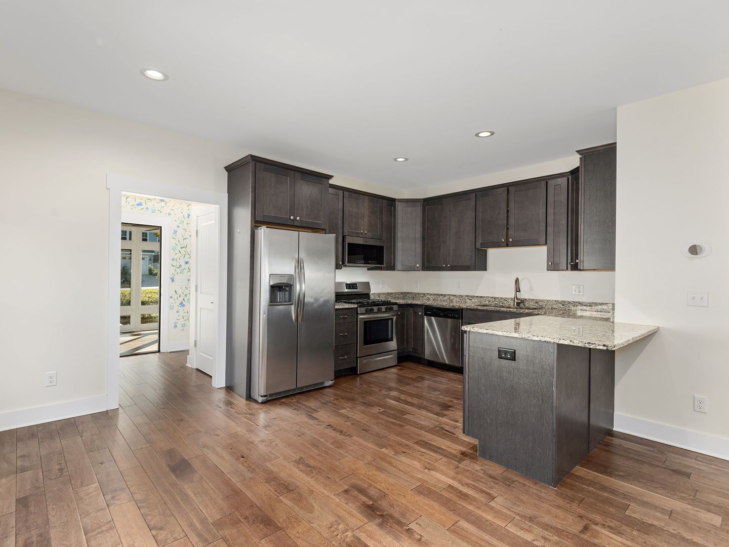 The open plan great room features a gas fireplace, plentiful recessed lighting, and pretty hardwood floors, with sleek shaker-style cabinets and granite countertops in the kitchen. Appliances include the refrigerator, gas range, microwave, and dishwasher. Off of the kitchen find the pantry, powder room, and laundry room with washer and dryer included. Enjoy great additional living space in the all-season sun room. A mini-split system provides thermostat controlled heating and air conditioning for this space. The fully fenced backyard is the perfect space to gather, grill, and garden with decking, flagstone paths, and raised beds.