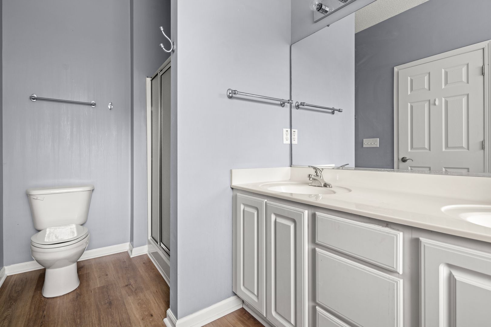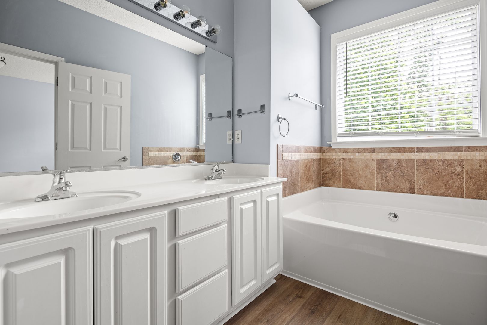The spacious main floor primary suite includes a bathroom with a double-sink vanity, shower, a separate garden bathtub, and a walk-in closet with built-ins. The bonus room at the top of the stairs is open to the great room below - perfect for your office or den. Also upstairs: two bedrooms and a full bathroom which has a double-sink vanity and a combination bathtub/ shower.