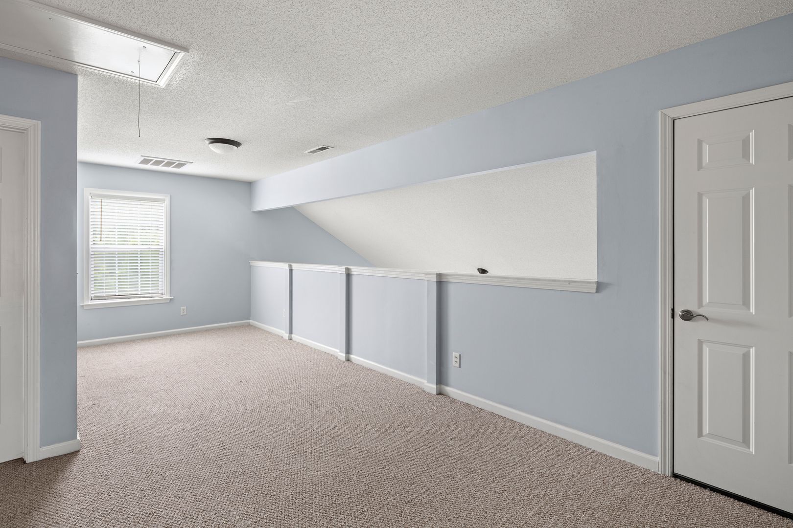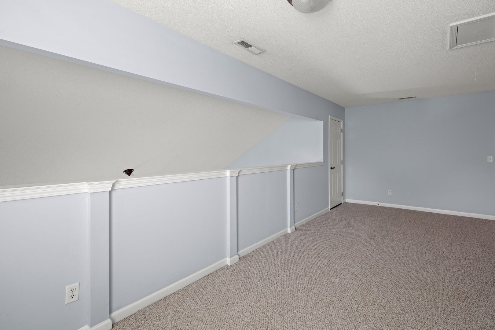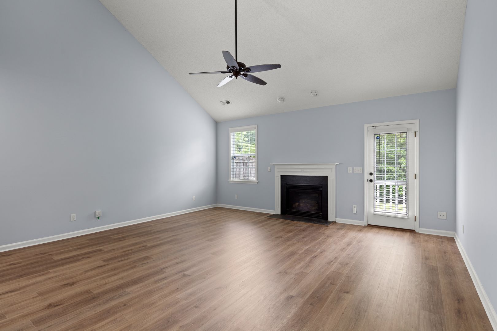 The living room features high ceilings, open with the upper-floor loft/ bonus space, a gas fireplace, and access to the back patio and fenced backyard. Attractive trim and wainscoting elevates the formal dining room.