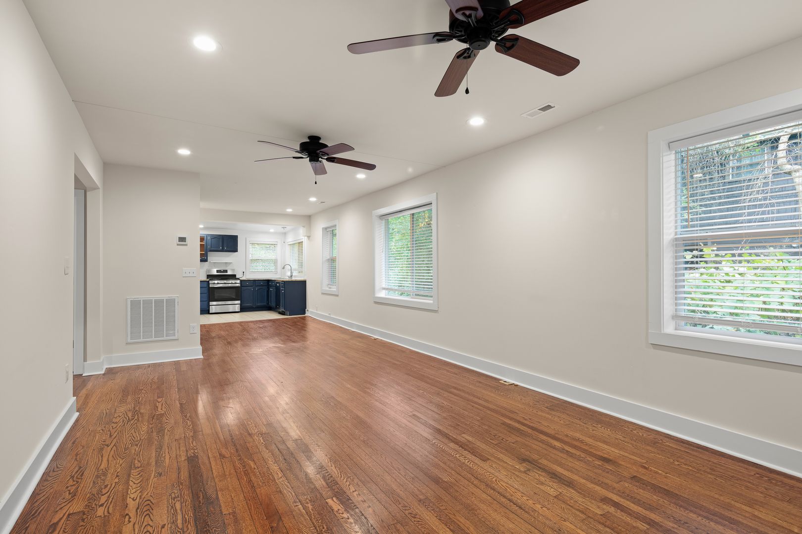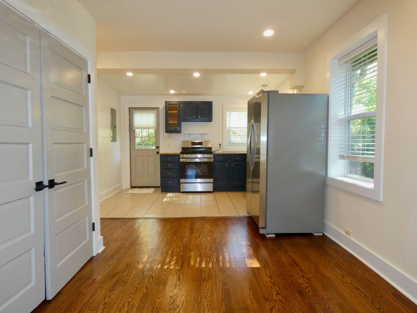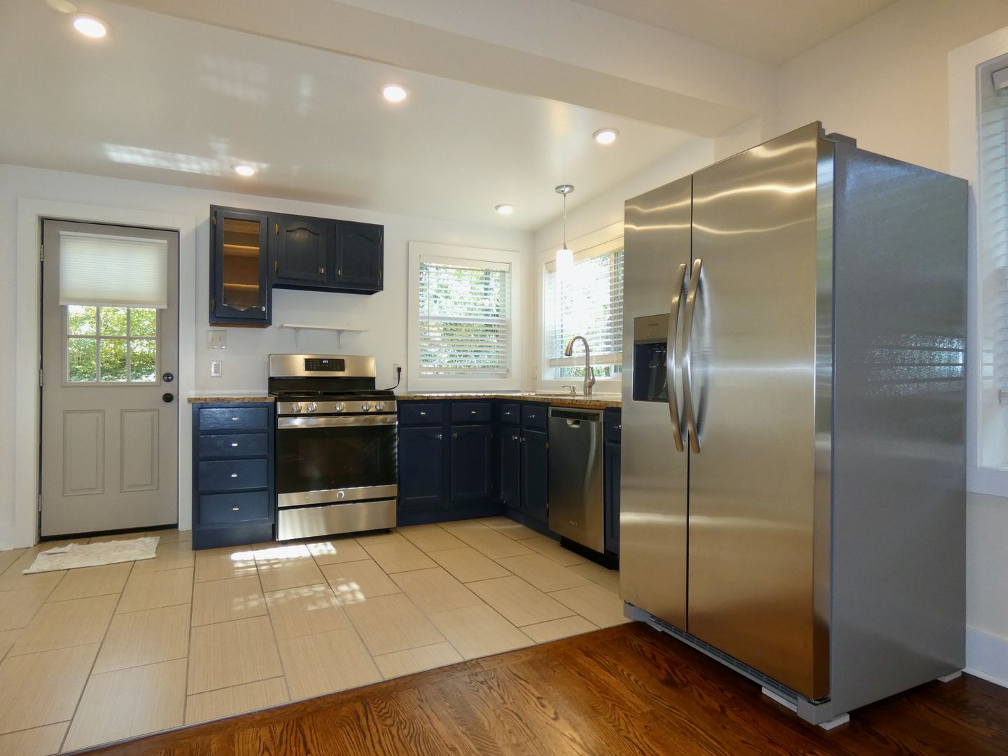 The open plan living, dining, and kitchen features recessed lights, ceiling fans, plentiful windows, and gorgeous original oak floors. The kitchen has tile floors, granite counters, and attractive cabinetry. Kitchen appliances include the gas range, refrigerator, and dishwasher. The laundry closet is between the living room and kitchen, and the full-size washer and dryer can stay for tenant use