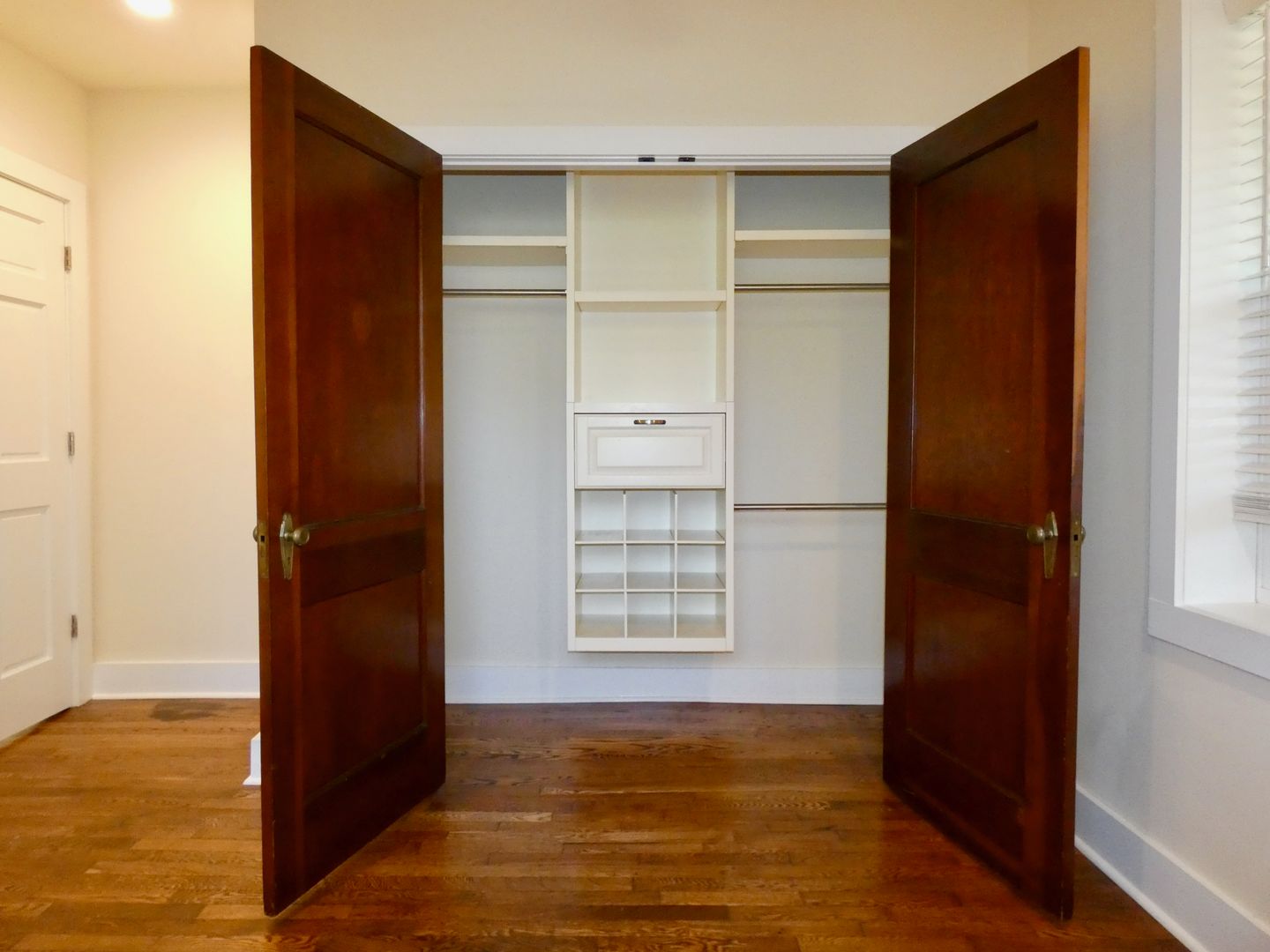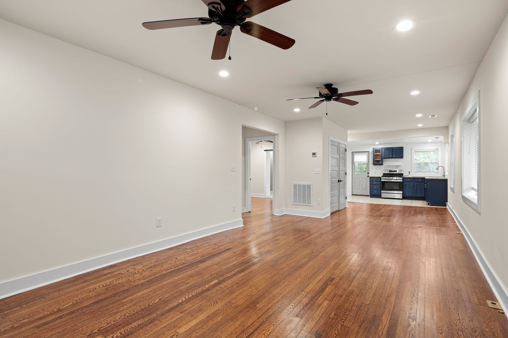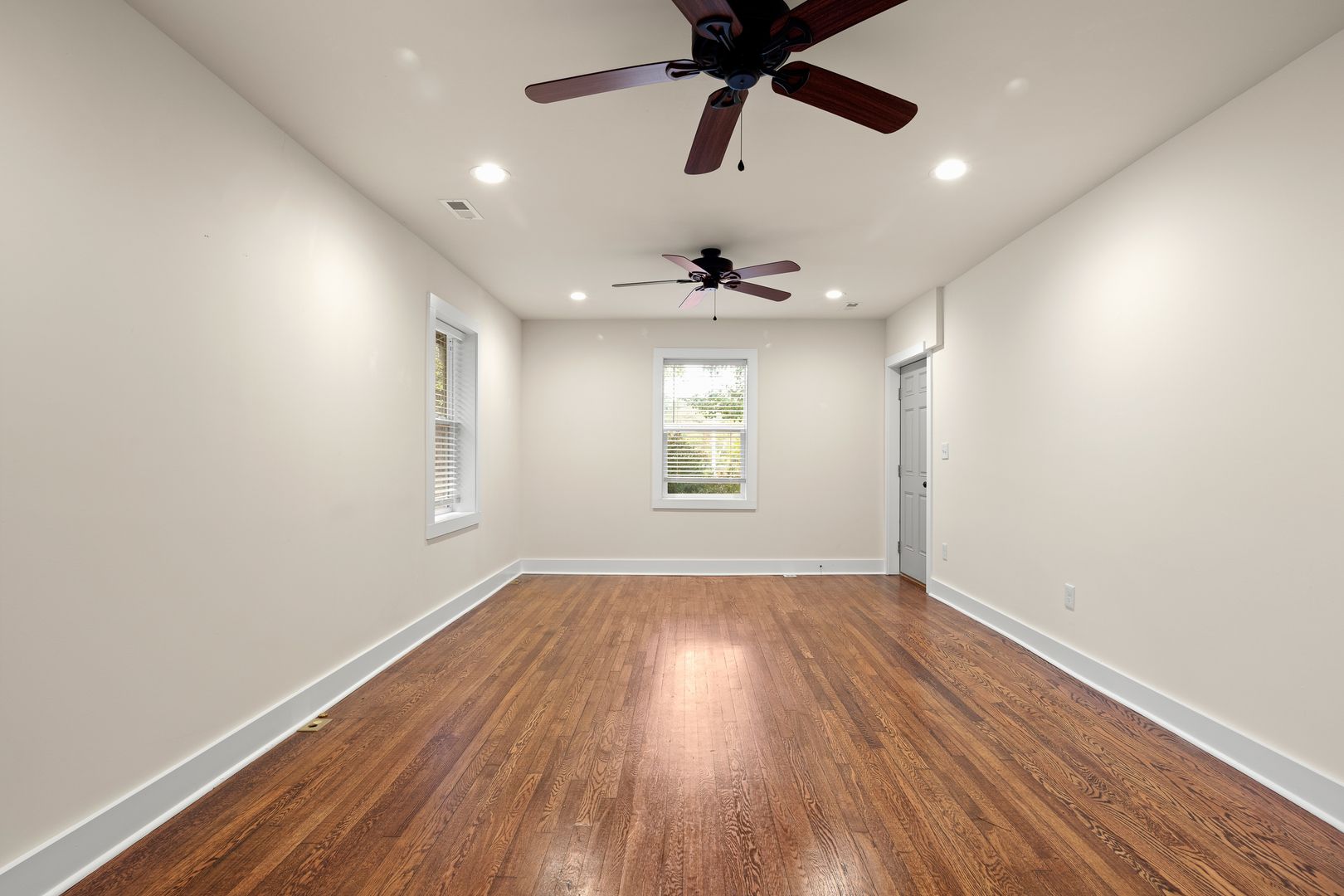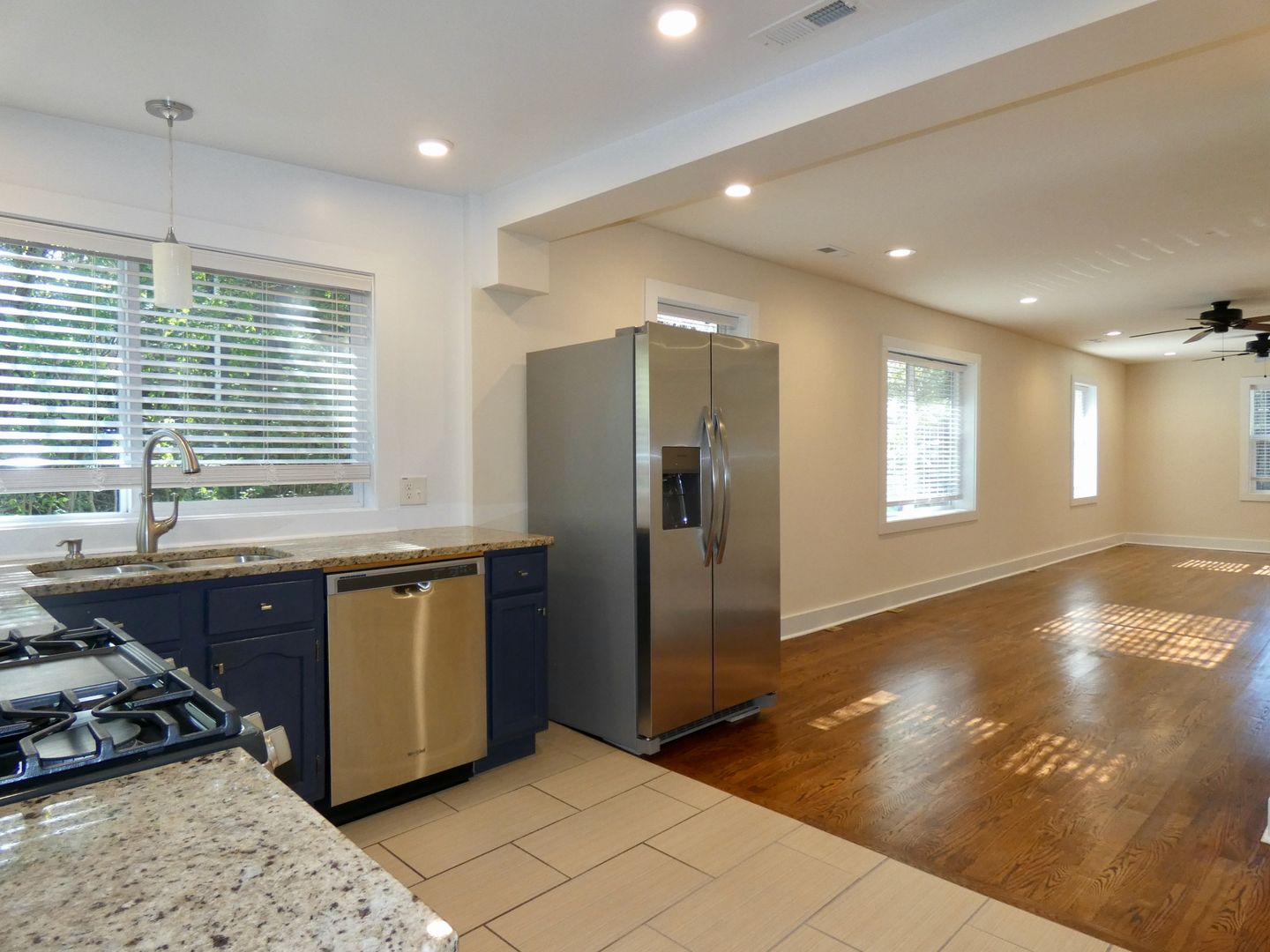 The open plan living, dining, and kitchen features recessed lights, ceiling fans, plentiful windows, and gorgeous original oak floors. The kitchen has tile floors, granite counters, and attractive cabinetry. Kitchen appliances include the gas range, refrigerator, and dishwasher. The laundry closet is between the living room and kitchen, and the full-size washer and dryer can stay for tenant use