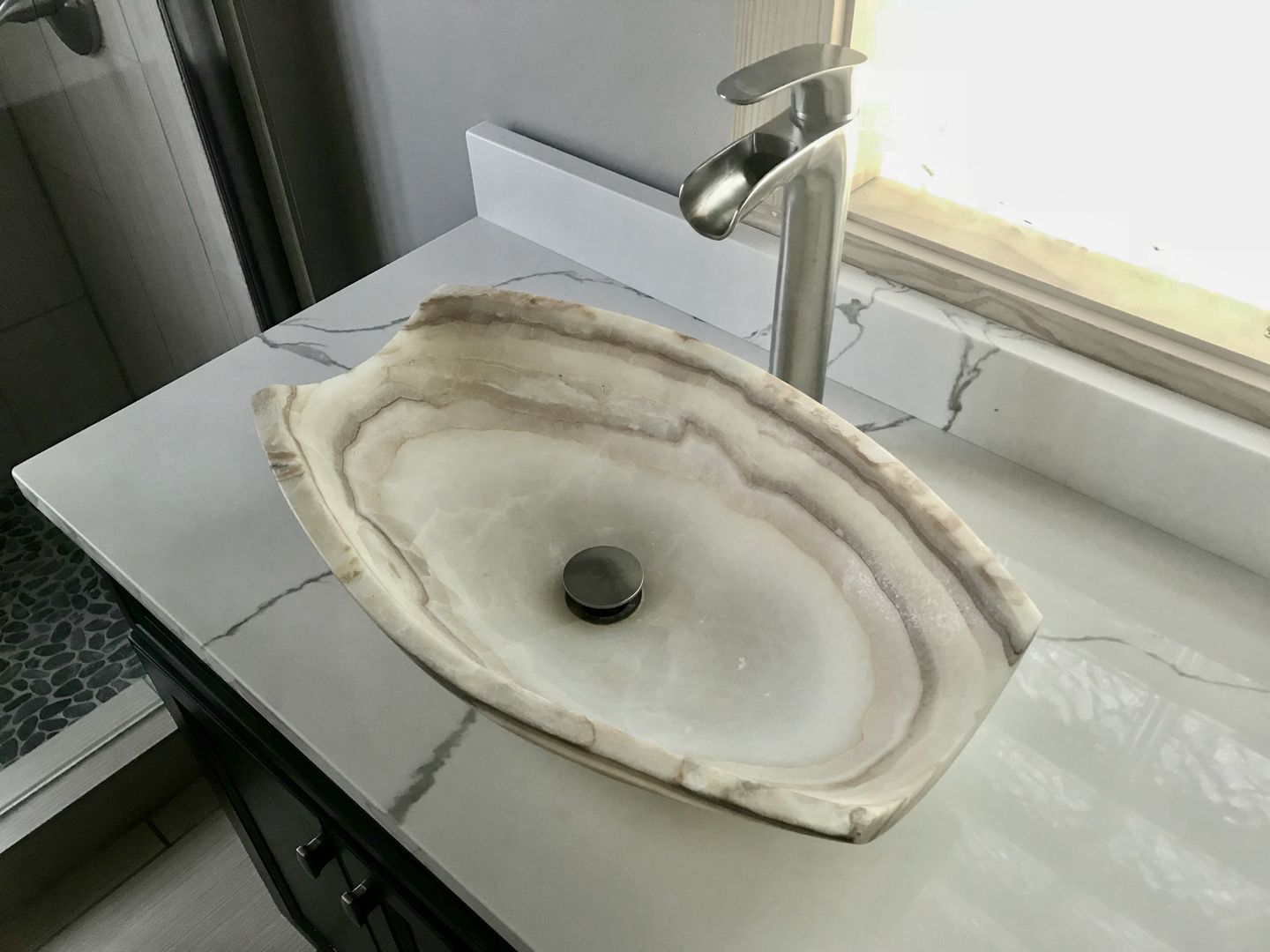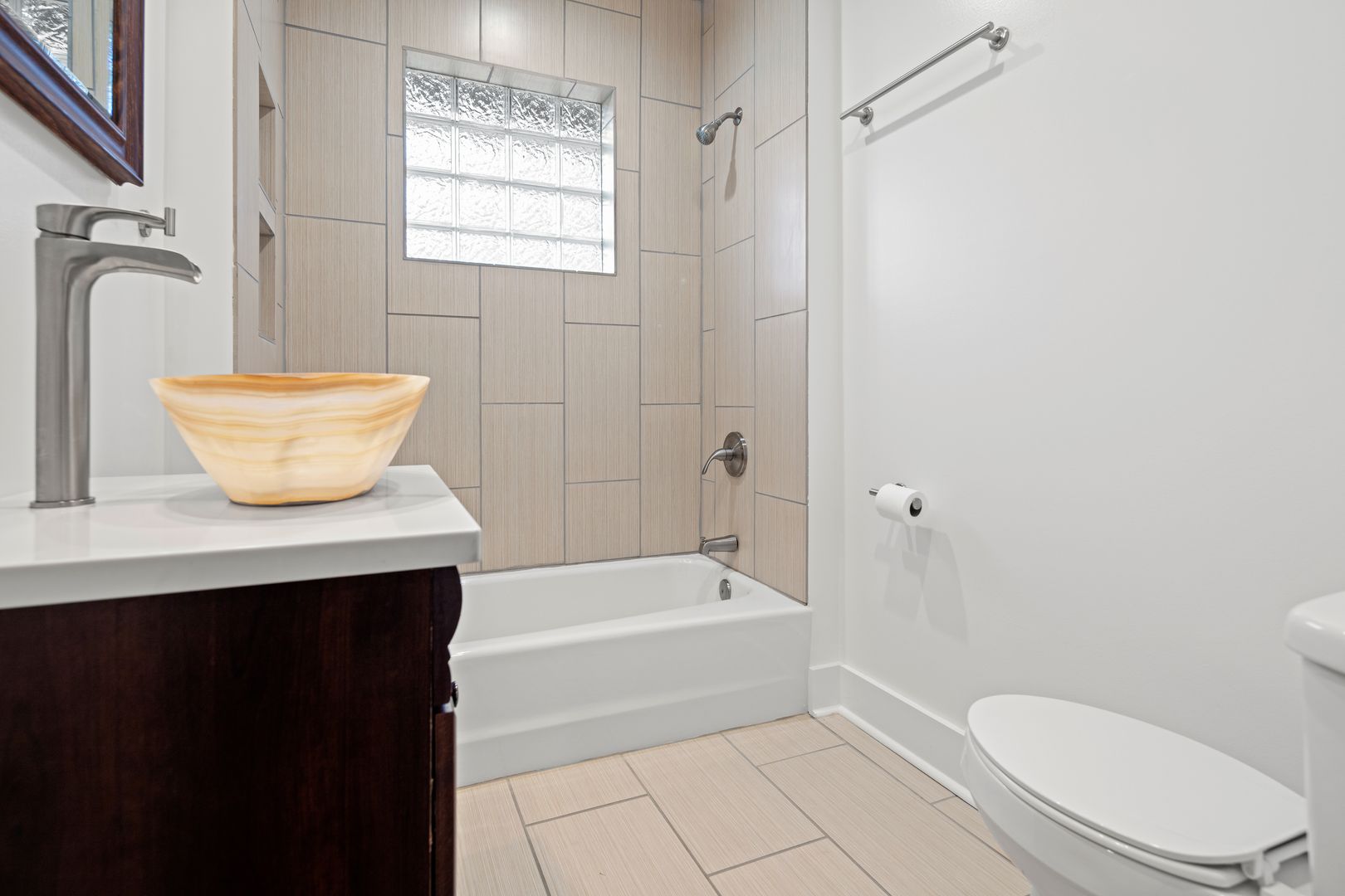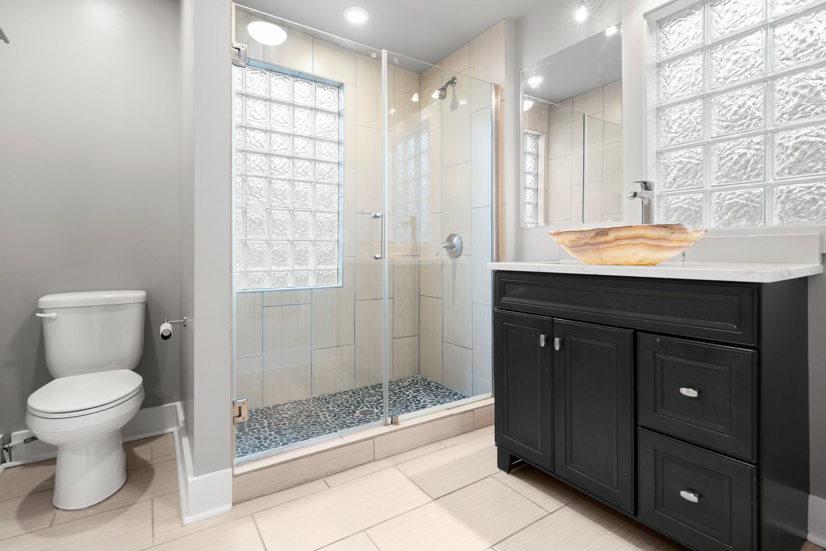 The primary bedroom offers a walk-in closet with shelving. Its tiled en suite bathroom has a walk-in shower, a stone-topped vanity with a unique stone basin, and a glass block window providing great natural light. The second bedroom has a double door closet equipped with nice shelving. The hall bathroom includes a combination shower/bathtub and has been finished similarly to the primary bath, with lovely tile and fixtures.
