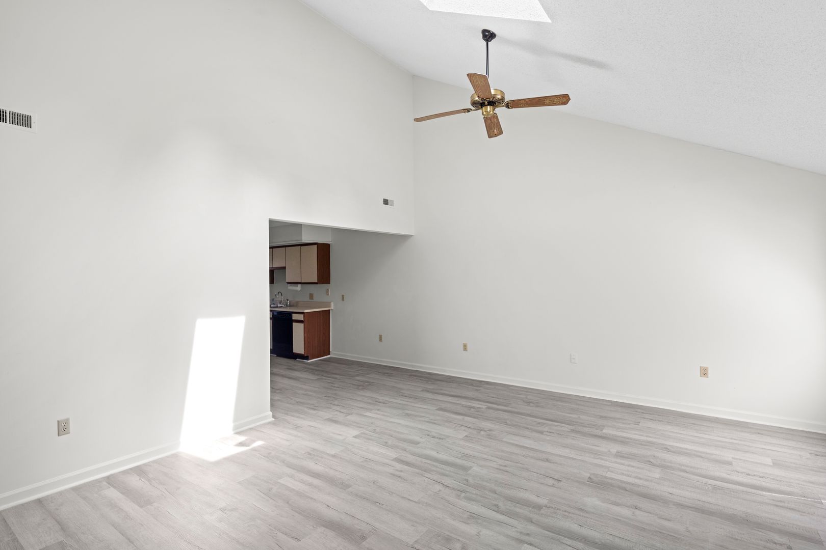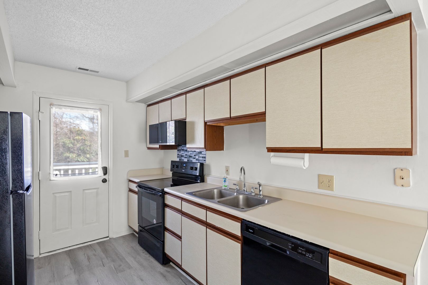 One-level townhouse in a great South Asheville location! The Cimarron community, tucked away off of Sweeten Creek Rd, offers well-manicured grounds, street lights, and a seasonal outdoor swimming pool. All new LVP flooring and fresh paint throughout! The open plan living room features a gas fireplace and vaulted ceilings with a skylight. The eat-in kitchen has a door to the back deck with stairs to green space behind the townhome. Appliances include the smooth-top electric range, refrigerator, microwave, and dishwasher. The primary bedroom includes a walk-in closet, double-sink vanity, and glass-door walk-in shower. The full hall bathroom has a combination bathtub/ shower. Washer and dryer hookups are in the hall laundry closet.